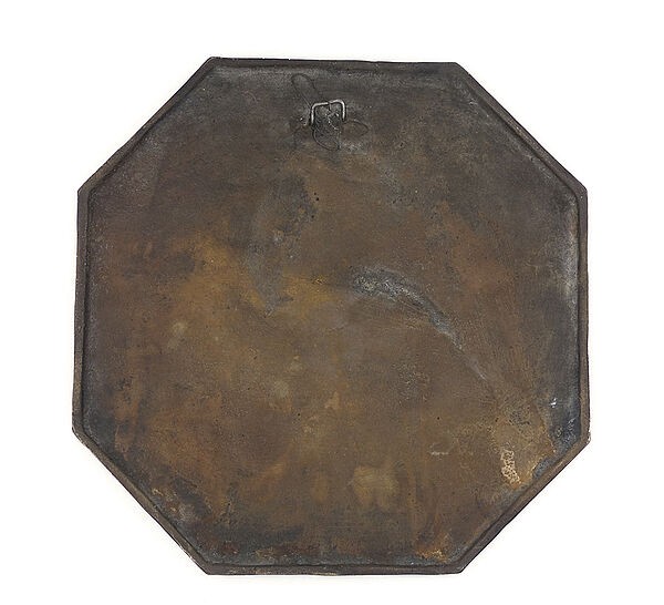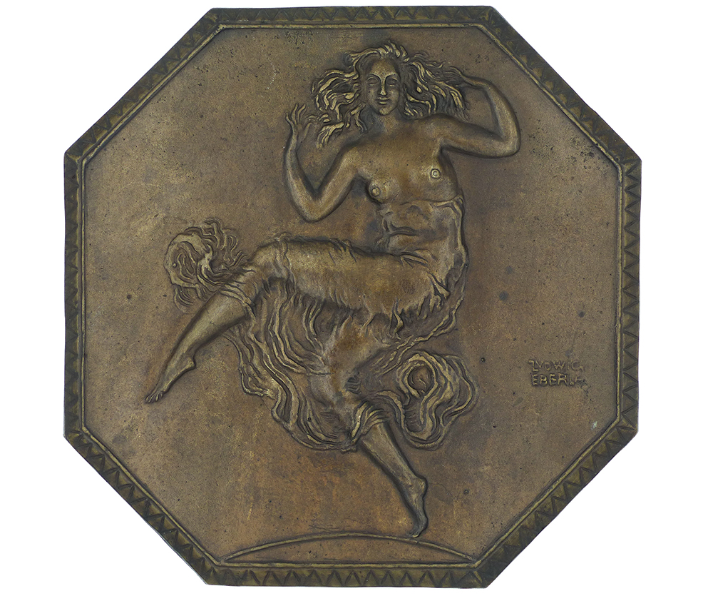 Achteckige, dunkelbraun patinierte Bronzeplatte, die vorderseitig eine tanzende, barbusige junge Frau mit wallendem Rock zeigt, rechts seitlich signiert. Maße ca. 22 x 22 cm, max. Durchmesser ca. 24 cm. geringe Altersspuren. Wohl 1910er, 20er Jahre.