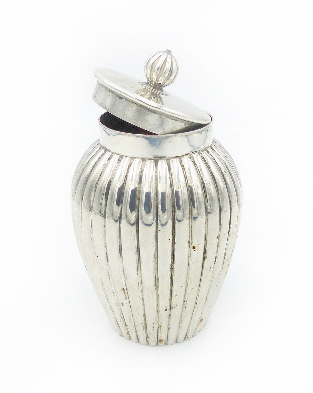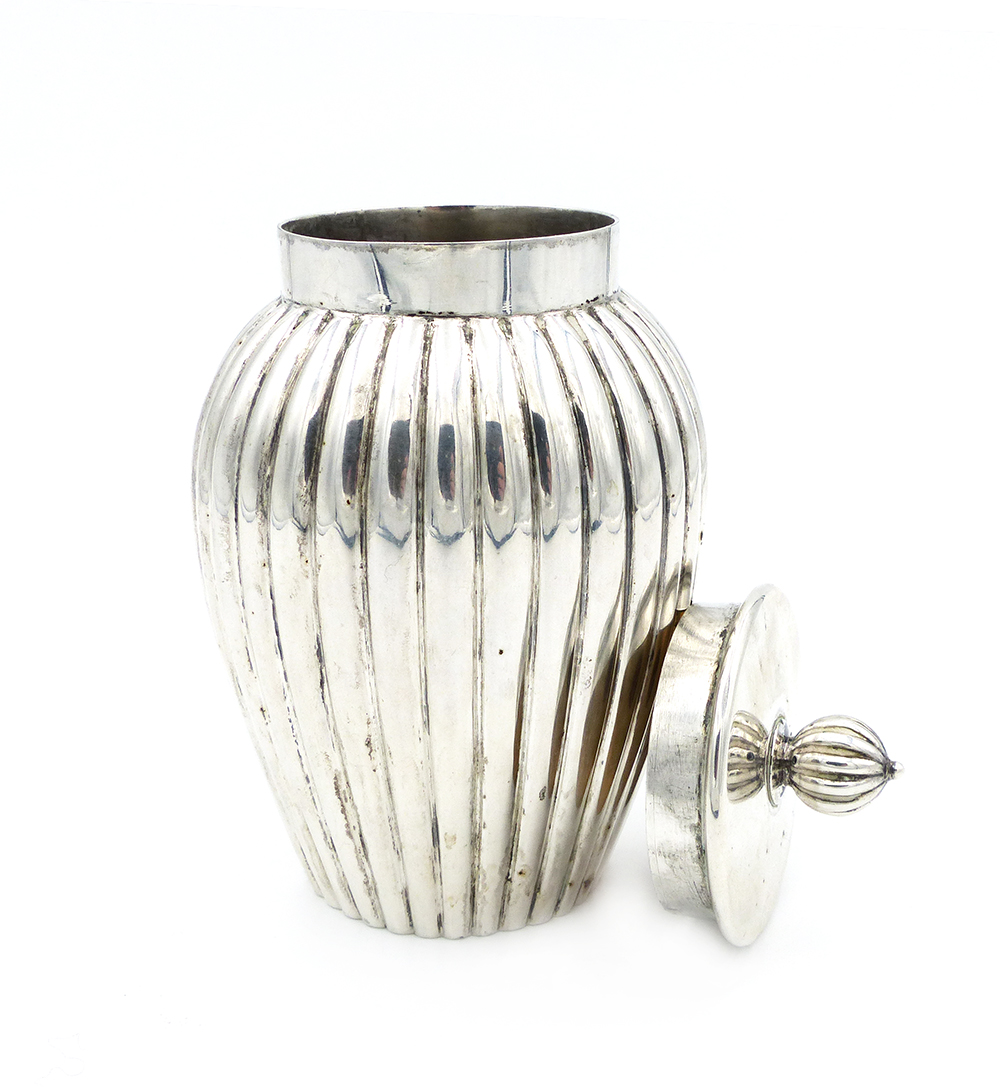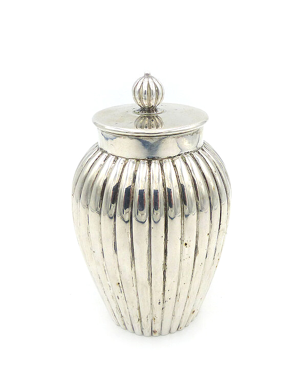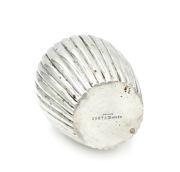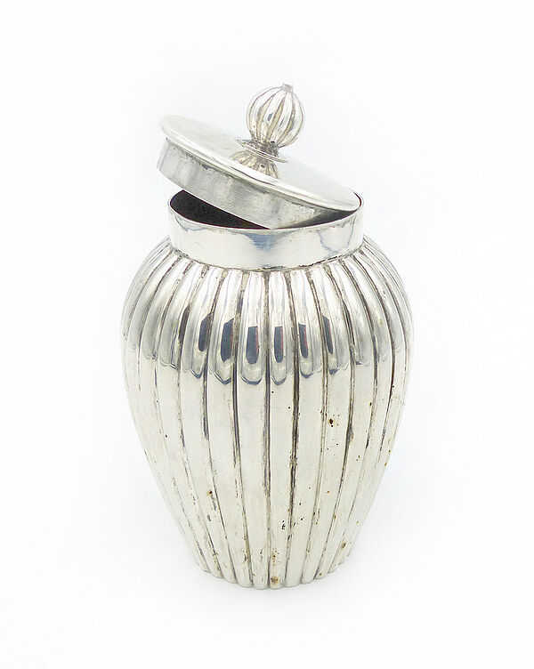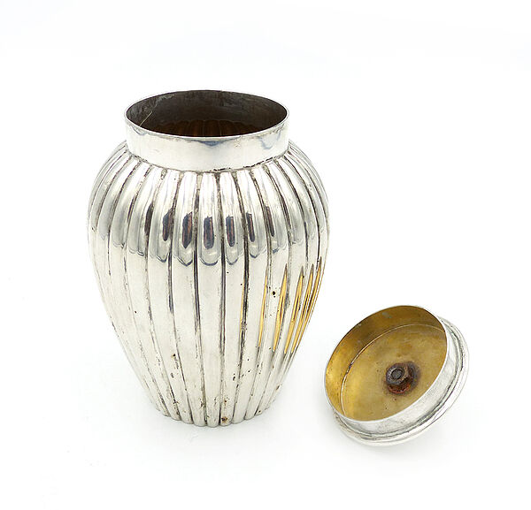 Angedeutet ovoid-gestreckter, außen gerippter, innen vergoldeter Silberkorpus (800er). Scheibenförmiger Deckel mit annähernd kugelförmiger, gerippter Handhabe. Maße ca. 11,5 x 7,5 cm, partiell geputzter Zustand mit kleinen Patina-Resten, geringe Altersspuren. Wohl um 1915.