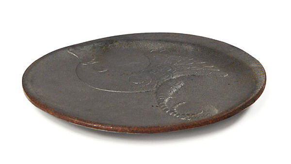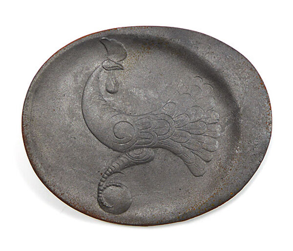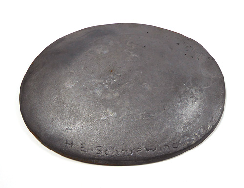 Quer-ovaler, flach schalenförmiger gusseiserner Korpus. Im Spiegel Flachrelief eines stilisierten Hahnes im Profil nach links, der Rand ist asymmetrisch angelegt bzw. rechts betont. Alt silberfarben gefasst. Maße ca. 23 x 18,5 cm, Höhe ca. 3 cm, geringe bis allenfalls moderate Altersspuren, eher im Sinne einer Patina, so zeigen sich Bereibungen der alten Fassung. Rückseitig monogrammiert und bezeichnet "H. E. Schniewind".