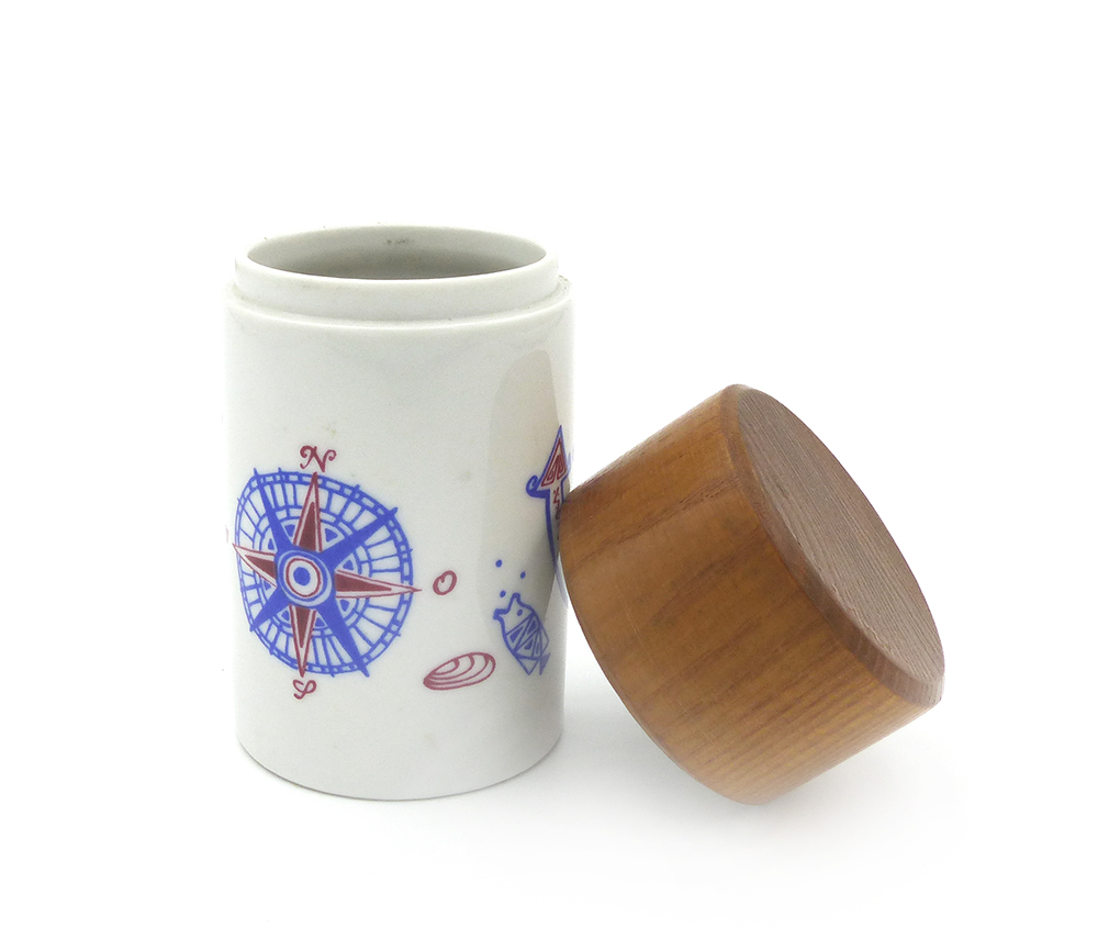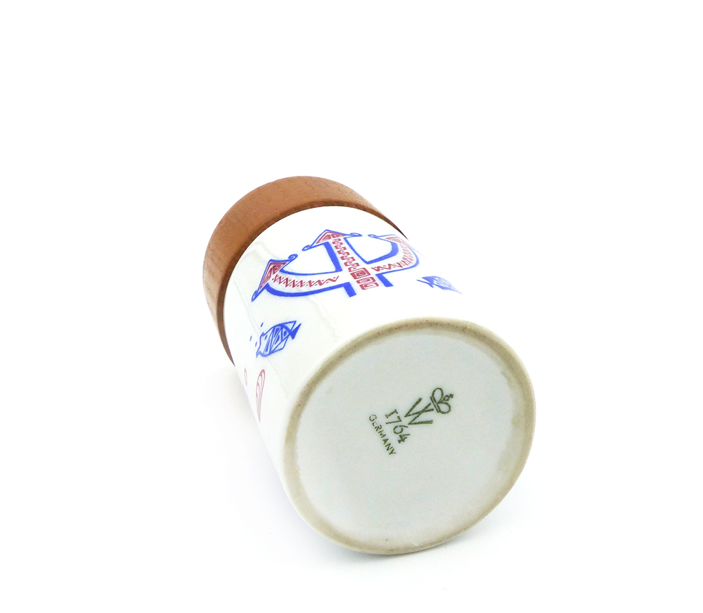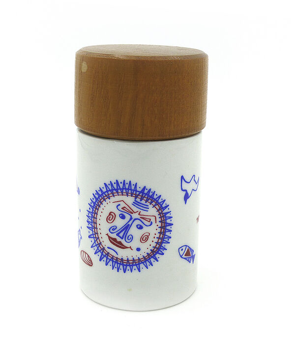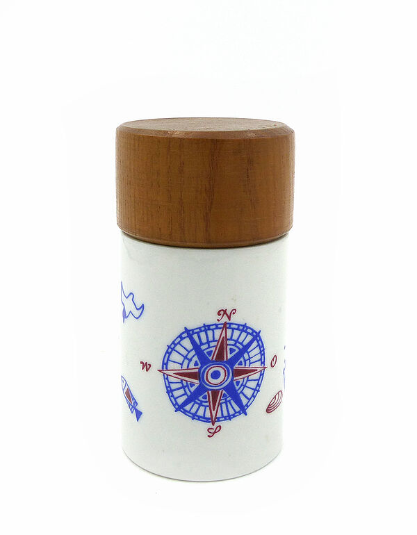 Zylindrischer Korpus aus weißem Porzellan, außenseitig Dekor aus stilisierten maritimen Motiven in Blau und Rot. Zylindrischer Holzdeckel. Höhe des Porzellankorpus ca. 7,5 cm, Gesamthöhe ca. 10 cm, geringe Alters- und Gebrauchsspuren. Unterseitig gemarkt. Wohl 1960er Jahre.