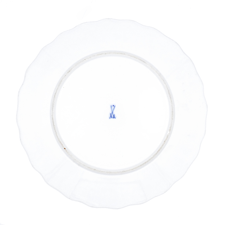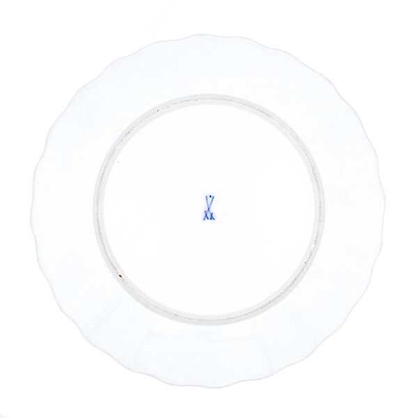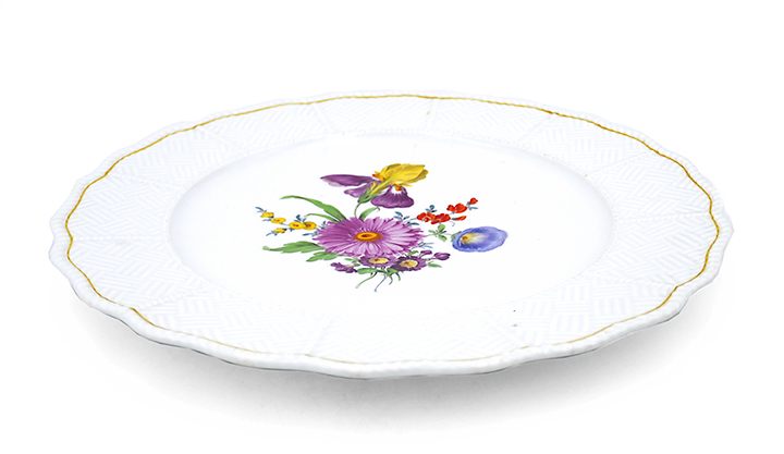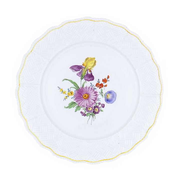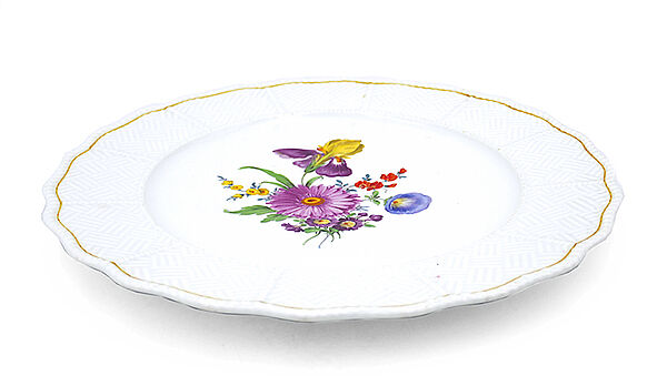 Flach tellerförmiger Korpus mit zart reliefierter Fahne, diese wird durch eine feine, schwefelgelber Linie vom Perlrand abgesetzt. Im Spiegel handgemaltes, polychromes Blumenmotiv. Durchmesser ca. 27 cm, minmale Altersspuren. Unterseitig sogenannte "Knopfschwertermarke", die 1924 vom damaligen Generaldirektor Max Adolf Pfeiffer eingeführt und bis 1934 verwendet wurde.