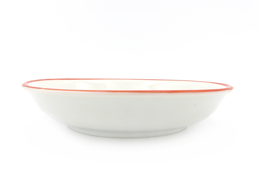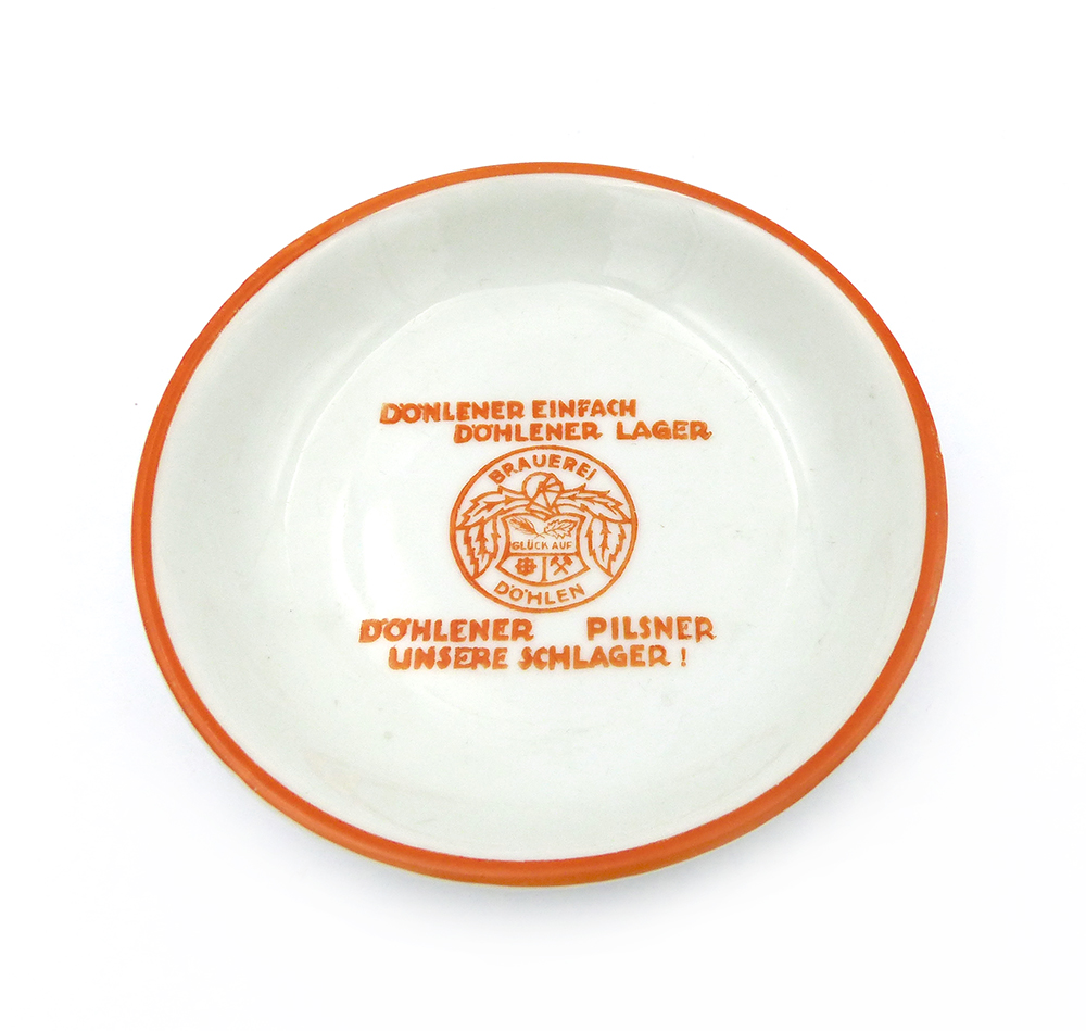 Flach-schüsselförmiger Porzellankorpus, der Rand ist leuchtend hellrot abgesetzt, im Spiegel ist das Signet der Brauerei zu sehen, zudem darüber die Bezeichnung “DÖHLENER EINFACH / DÖHLENER LAGER” bzw. darunter “DÖHLENER PILSNER / UNSERE SCHLAGER!”. Durchmesser ca. 12,5 cm, geringe Altersspuren. Unterseitig Markung (die zwischen 1819 und 1933 im Gebrauch war), wohl 1920er Jahre.