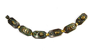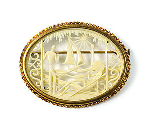 Silberne Brosche mir figürlichem Dekor und 3 Schmucksteinen