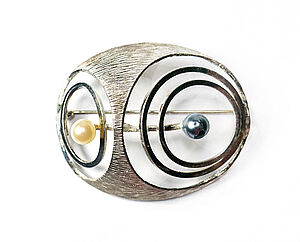 Silberne Brosche mit abstraktem Dekor und 2 Perlen