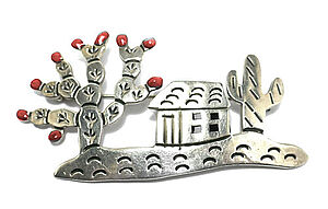 Große Silberbrosche in Form einer urbanen Landschaft mit Kakteen