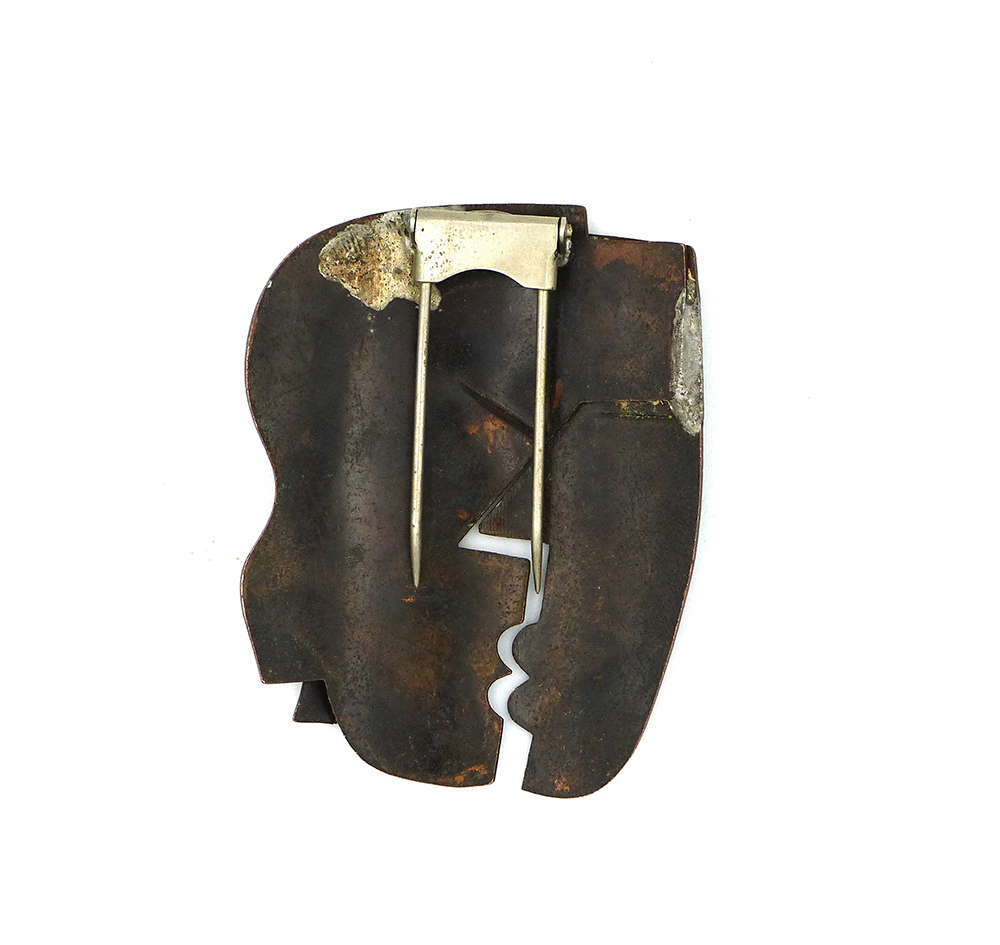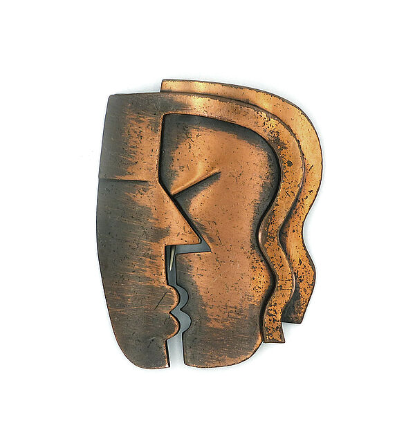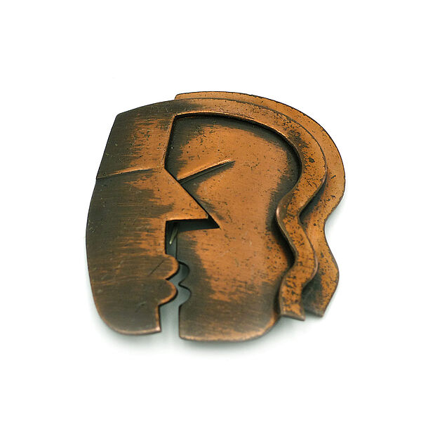Flacher, halbplastischer, partiell patinierter und zaponierter Kupferkorpus, der ein stilisiertes männliches und weibliches Gesicht im Profil darstellt, zum Kuss zugewandt. Maße ca. 5,5 x 4,5 cm, ungeputzter Zustand mit partieller Alterspatina und geringen Tragespuren. Rückseitig einfache, zweinadlige Broschierung mit Lötspuren. Wohl 1950er Jahre. “The Kiss” dürfte mit zu den bekanntesten Schmuckstücken des Künstlers zählen.