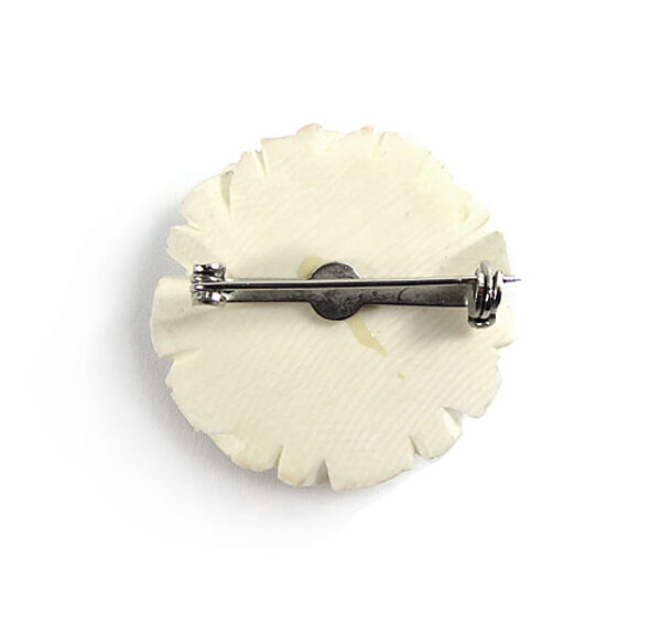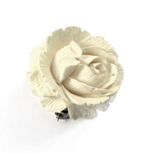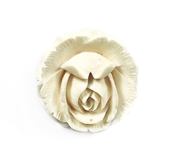 Fein geschnitzter Elfenbeinkorpus in Form einer Rosenknospe. Durchmesser ca. 3,5 cm, geringe Tragespuren. Rückseitig Sicherheitsbroschierung aus Metall. Wohl Erbach der 1930er bis 70er Jahre.