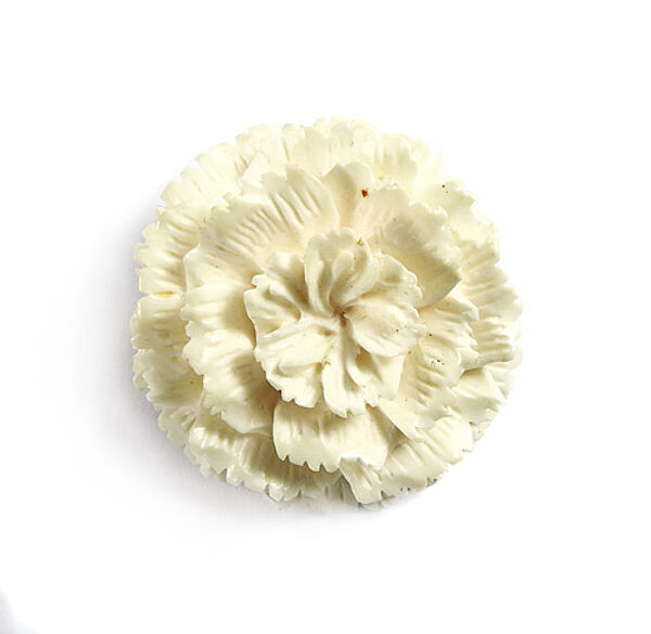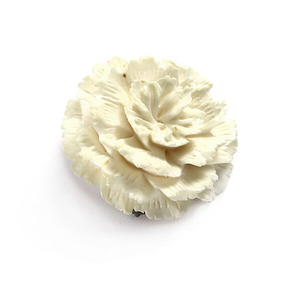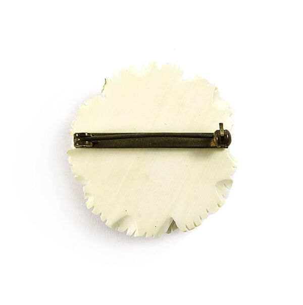 Geschnitzter Elfenbeinkorpus in Form einer Blüte. Durchmesser ca. 3,5 cm, geringe Tragespuren. Rückseitig Sicherheits-Broschierung aus Messing mit Kugelkopf. Wohl Erbach der 1930er bis 70er Jahre.