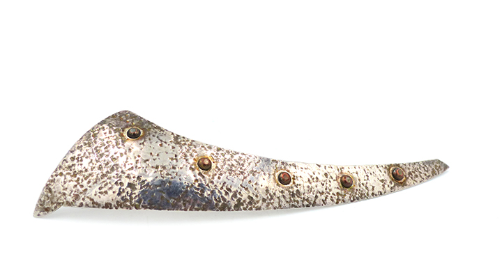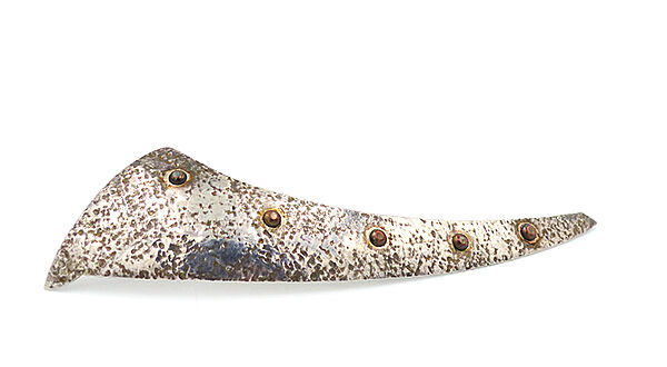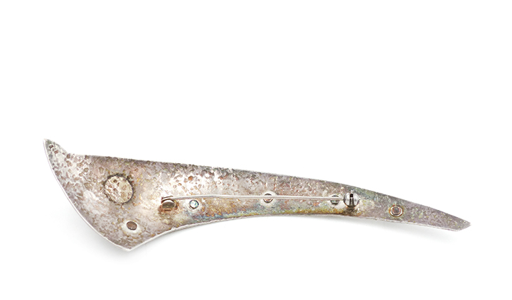Handgetriebener, schweiförmiger, leicht konvex gewölbter Silberkorpus (925er) mit martellierter Oberfläche über die sich eine Reihe von 5 kleinen Kupfernieten zieht. Länge ca. 12 cm, maximale Breite 4 cm. Ungeputzter Zustand mit leichter Patina und geringen Tragespuren. Rückseitig Sicherheitsbroschierung mit Kugelkopf und ungedeutete Markung. Die Entstehungszeit ist für uns schwer zuzuordnen, evtl. 1920er, 30er oder eher 1960er, 70er Jahre??