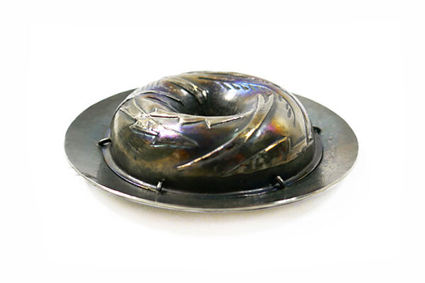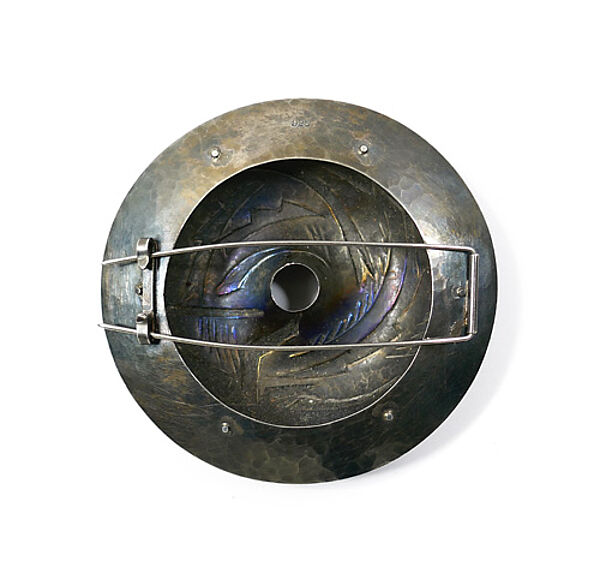 Das zentrale Element der Brosche ist ringförmiges, gewölbtes Titanelement mit feinem, leicht erhabenem, handgetriebenem Dekor. Hierbei handelt es sich um einen Ohrring von Volker Knauf. Er wurde Anfang der 1990er Jahre gefertigt. Ende der 1990er Jahre wurde dieser von Claudia Baugut, die u.a. bei Volker Knauf an der Kunsthochschule Burg Giebichenstein studiert hat, mit kleinen Krappen in einen umlaufenden, leicht konkaven Silberreifen (925er) integriert. Durchmesser ca. 6,3 cm, ungeputzter Patina mit dunkler (Silber) bzw. dunkler und bläulicher (Titan) Patina, geringe Tragespuren. Rückseitig doppelläufige Broschierung. Der Ohrring wurde von der Vorbesitzerin von Volker Knauf erworben und dann später von Claudia Baugut zur Brosche umgearbeitet (s.o.).