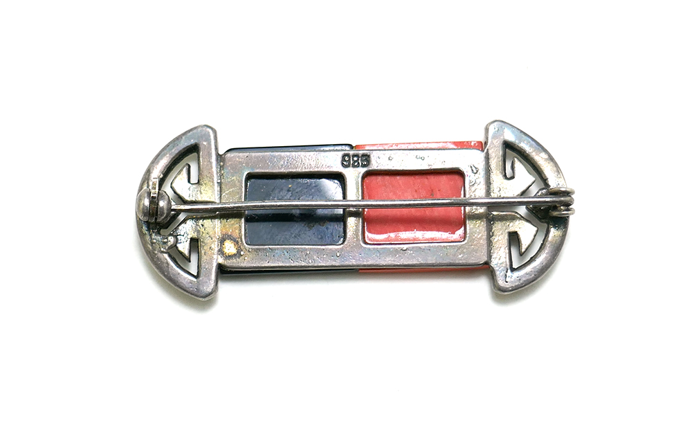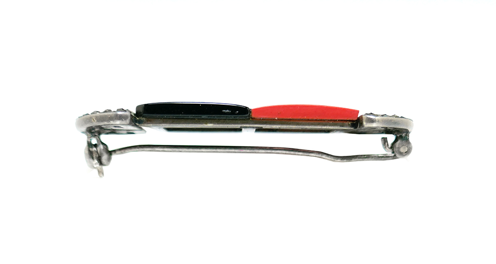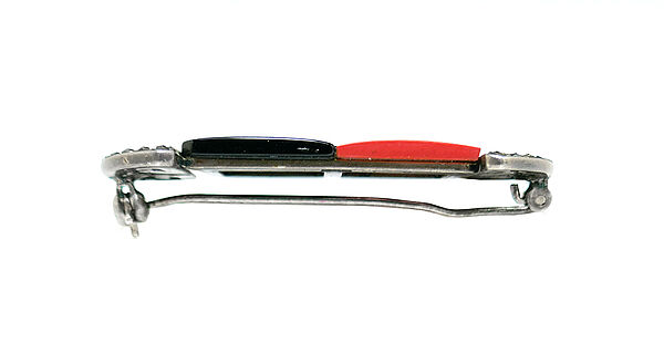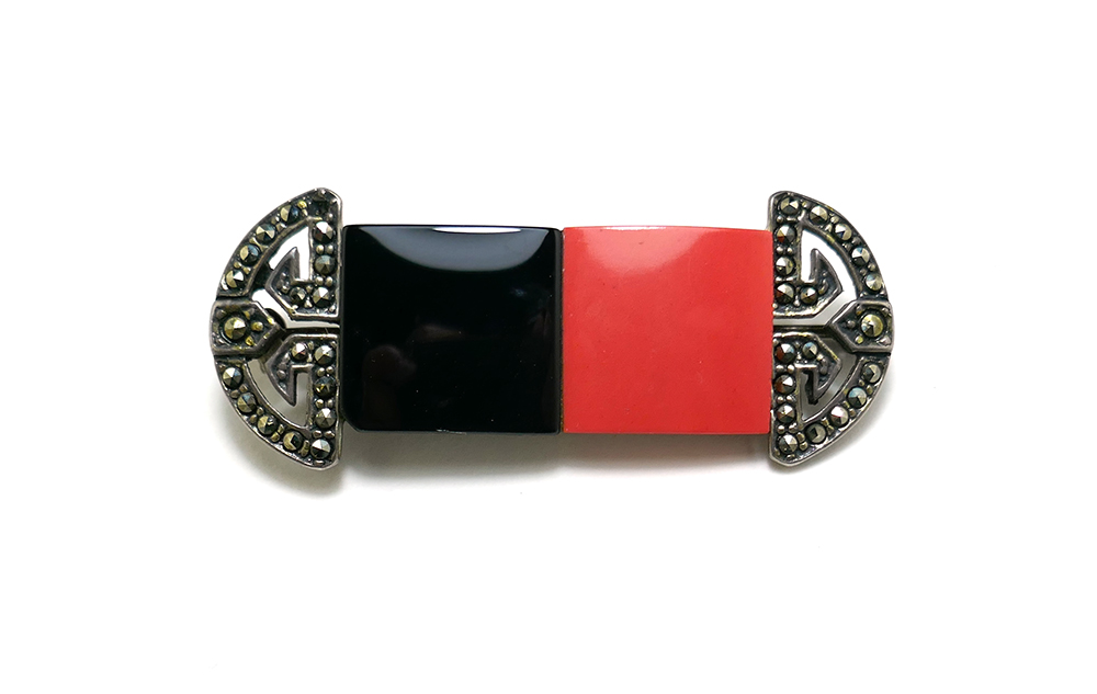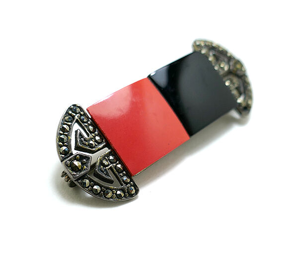 Annähernd bandförmiger Silberkorpus (925er), der vorderseitig durch zwei quadratische Schmucksteinplatten dominiert wird, einer roten und einer schwarzen (evtl. Korallen- bzw. Onyx-farbene Kunststoffplatte), an den kurzen Enden finden sich jeweils offen gearbeitete, halbkreisförmige Zierelemente, die mit Markasiten besetzt sind. Maße ca. 5 x 2 cm, ungeputzter Zustand mit leichter Patina und geringen Tragespuren. Rückseitig Sicherheitsbroschierung mit Kugelkopf. Ungemarkt, wohl Deutschland der 1920er, 30er Jahre.