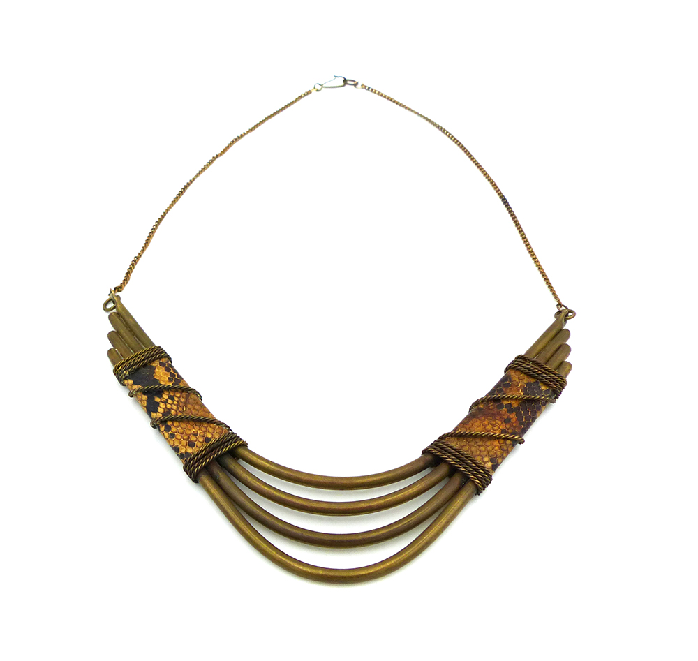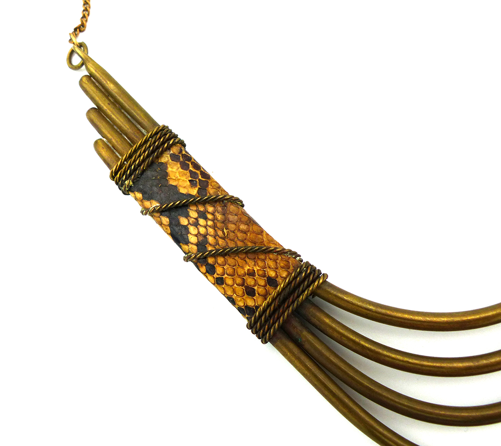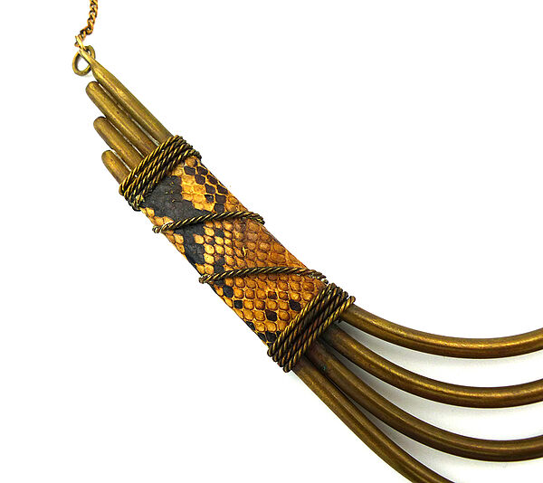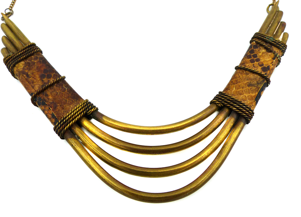 Messing-Collier aus feingliedriger Kette mit zartem Karabinerverschluss und dominierendem Mittelteil, welches aus vier parallel verlaufenden Stabelementen besteht, deren Enden jeweils mit dekorativ gezeichnetem (Schlangen?)Leder umwickelt sind, gehalten durch kleine Messingkordeln. Umfang ca. 45 cm, ungeputzter Zustand mit leichter Patina und geringen Tragespuren. Wohl 1970er Jahre. Evtl. hallischer Künstler (zumindest in einem hallischen Haushalt erworben).