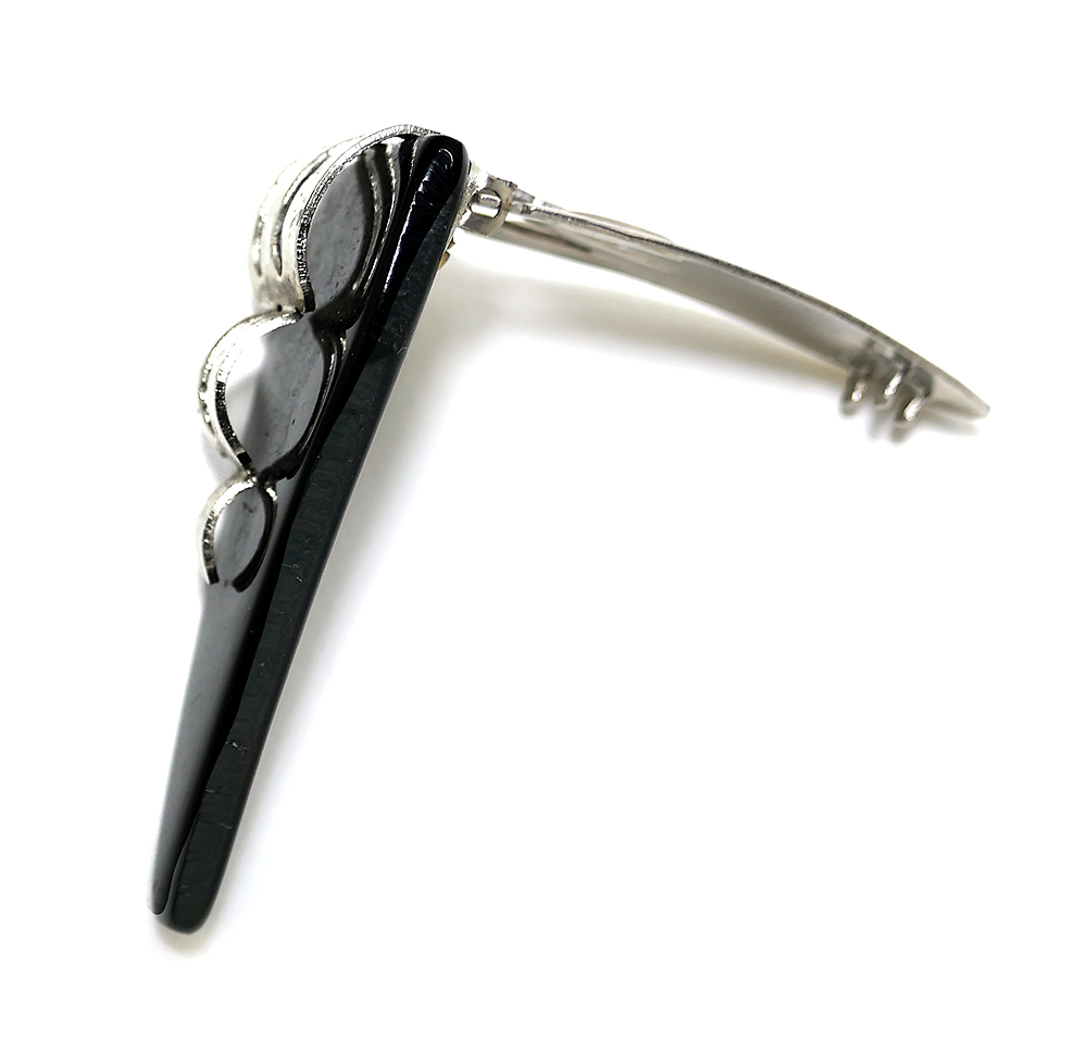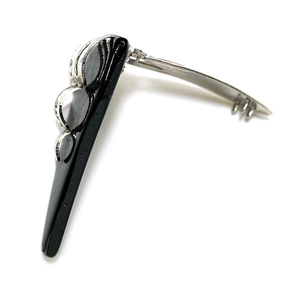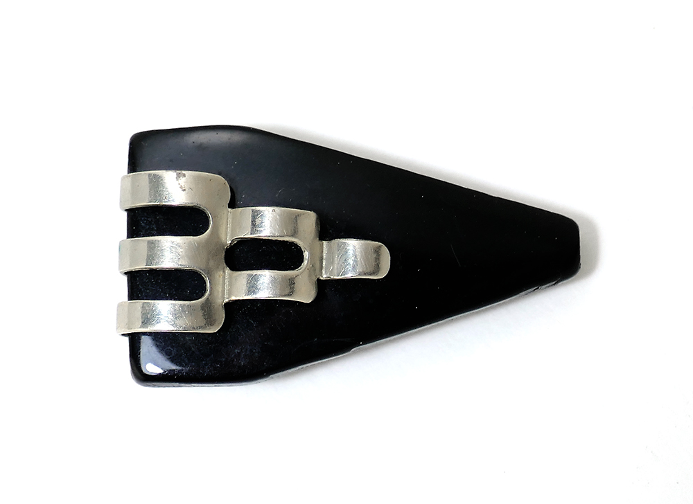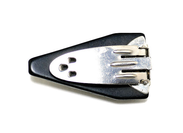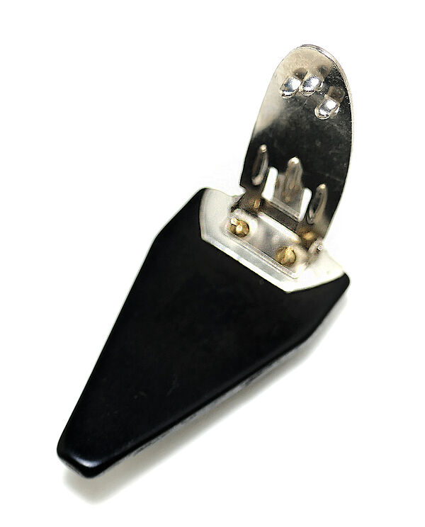 Annähernd dreieckiger Korpus aus schwarzem Kunststoff, an der oberseitigen Basis ist ein gitterartig durchbrochenes, verchromtes oder vernickeltes (?) Metallelement aufgesetzt. Maße ca. 4,5 x 2,5 cm, geringe Tragespuren. Rückseitig Klipp-Mechanismus aus Metall. Wohl 1920er bis 40er Jahre.