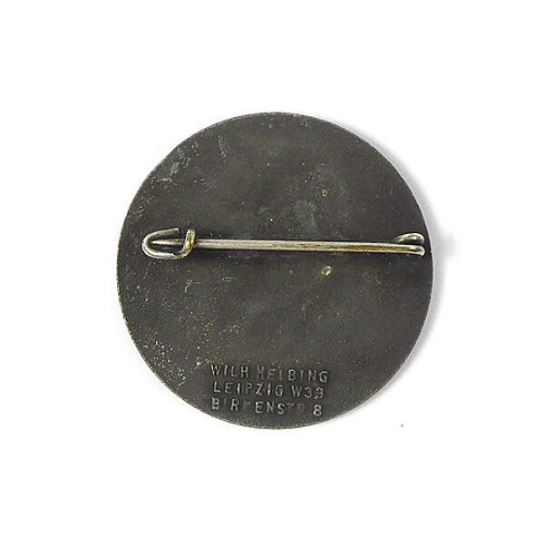 Geprägter Zinkkorpus. VS: Brustbild Luthers im Talar mit Barett, im Randbereich bezeichnet: "Luther-Bibel + 400 Jahre + Deutsche Schriftsprache". RS: mittig einfache Broschierung, darunter Markung der Firma WILH. HELBING / LEIPZIG W 33 / BIRKENSTR. 8. Durchmesser ca. 3,3 cm, ungeputzter Zustand mit dunkler Patina und leichten tragespuren.