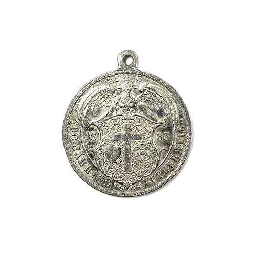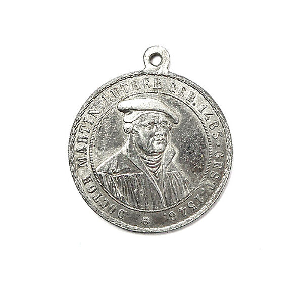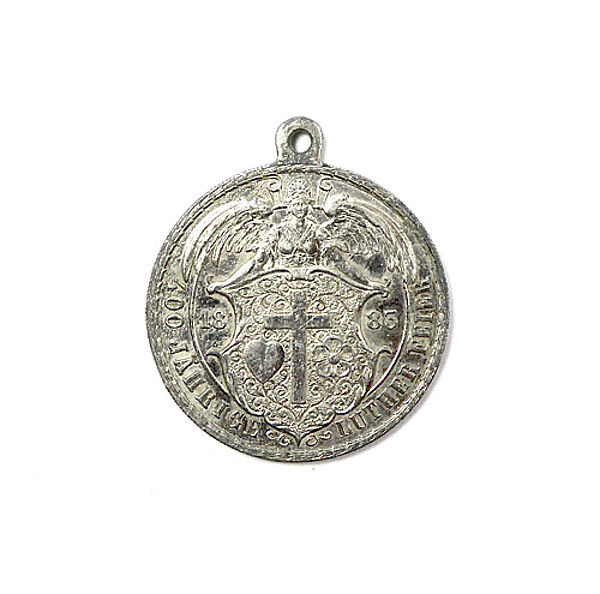 Geprägte Medaille aus Weißmetall mit angeprägter Öse. VS: Brustportrait Luthers nach halbrechts im Talar mit Barett. Umlaufend bezeichnet: "DOCTOR MARTIN LUTHER GEB. 1483 - GEST. 1546". RS: ein stehender Engel hält ein Schild auf dem mittig ein großes Kreuz abgebildet ist, sowie links davon ein Herz, rechts davon die Lutherrose, im Feld die Jahreszahl "18 - 83". Umlaufend bezeichnet: "400JÄHRIGE LUTHER FEIER". Durchmesser ca. 3 cm, ungeputzter Zustand mit homogener, warmer Patina und geringen Altersspuren.