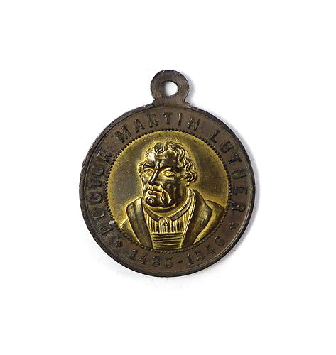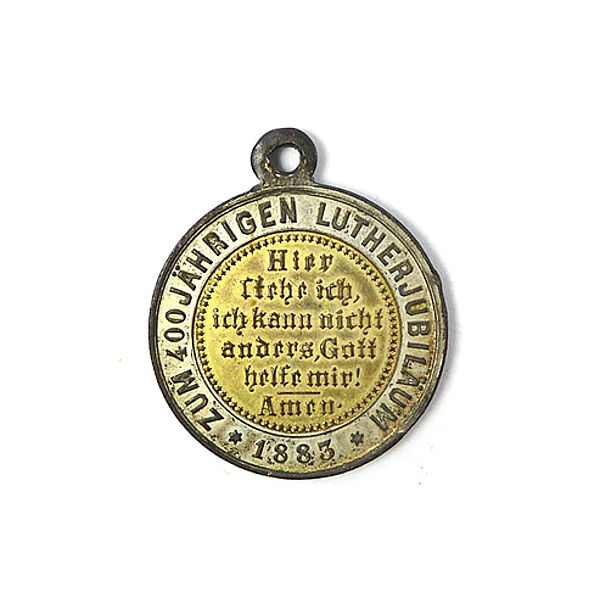Geprägte Medaille aus Bronze, die Felder vergoldet, der Randbereich versilbert, angeprägte Öse. VS: Brustbild Luthers frontal im Talar, den Kopf halb nach links gewandt (das Portrait geht auf einen Entwurf von Adolf Schwerdt zurück). Umlaufend bezeichnet: "DOCTOR MARTIN LUTHER 1483 - 1546". RS: vergoldete Inschrift mittig im Feld: "Hier / stehe ich, / ich kann nicht / anders, Gott / helfe mir! / ---- / Amen.", im Randbereich bezeichnet: "ZUM 400 JÄRIGEN LUTHERJUBILÄUM 1883". Durchmesser ca. 2,8 cm, ungeputzter Zustand mit teilweise Berieb der Vergoldung bzw. Versilberung u.a. Altersspuren.