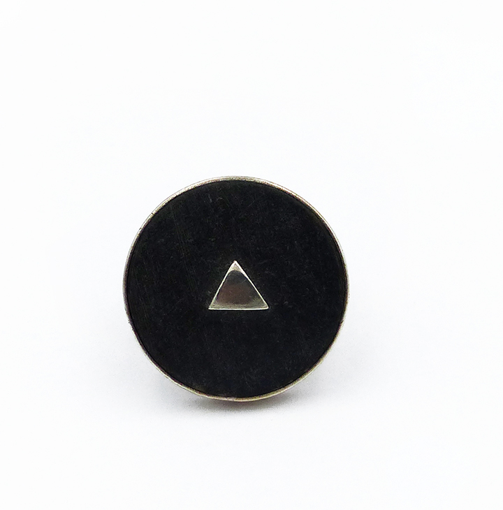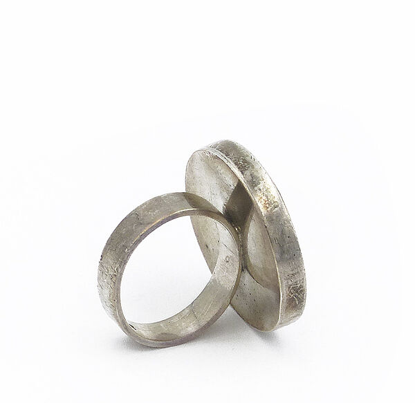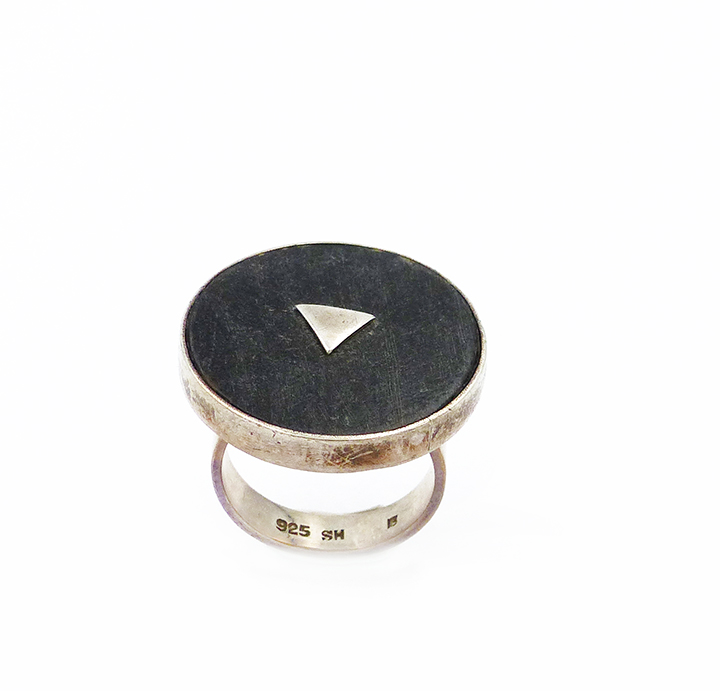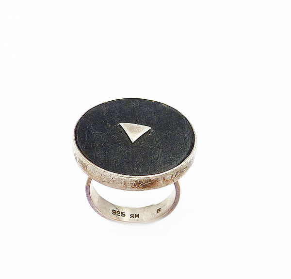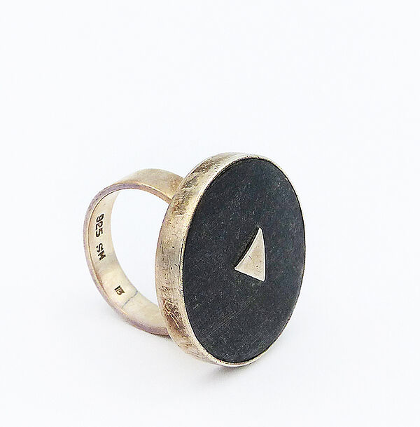Silberner Ring (geprüft) mit einfacher bzw. “klassischer” Ringschiene, scheibenförmiger Kopf mit zargengefasster Scheibe aus versteinertem Holz, mittig kleines silbernes Element in Dreiecksform. Durchmesser des Ringkopfes ca. 2,5 cm, Innenmaß ca. 16,5 mm, ungeputzter Zustand mit geringen Tragespuren. Wohl 1960er, 70er Jahre.