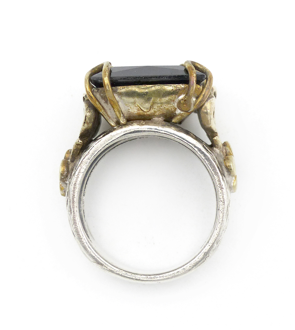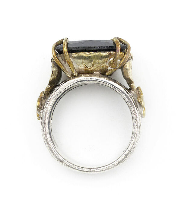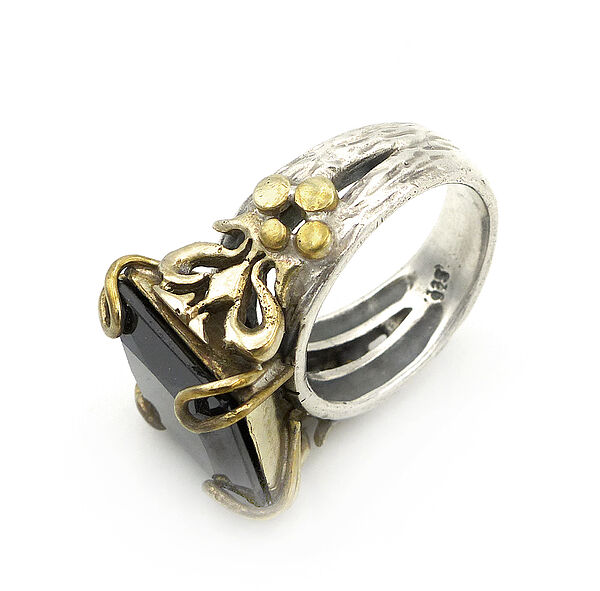 Handgefertigter Silberkorpus (925er), die Ringschiene teilt sich jeweils im Bereich der Ringschulter, hier ist ihr ein floral-stilisiertes (vergoldetes?) Messinggeflecht aufgesetzt, aus dem heraus vier Krappen einen kissenartig-facettierten, dunklen Schmuckstein (wohl Hämatit) tragen, der ca. 15 x 15 mm misst, Ringmaß ca. 57. Ungeputzter Zustand mit leichter Patina und geringen Tragespuren. Wohl 1960er Jahre.