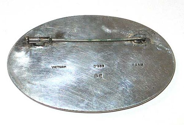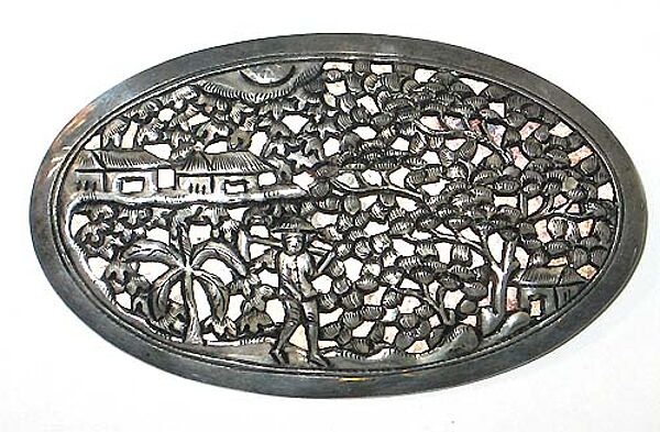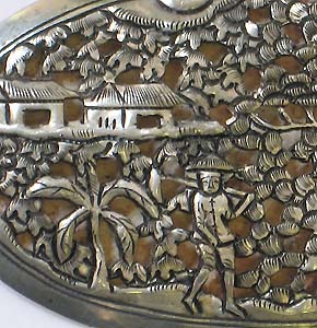 Der ovale Silberkorpus (900er) zeigt vorderseitig eine offen gearbeitete, fein ausgeführte Landschaft mit Bäumen und Häusern, im Vordergrund ist ein Mann mit Strohhut zu sehen, der über der Schulter eine Hacke (?) trägt. Breite ca. 5,8 cm, ungeputzter Zustand mit leichter Patina und geringen Gebrauchsspuren, insbesondere ist die rückseitigige Nadel der Sicherheitsbroschierung (mit Schiebehülse) leicht verbogen. Rückseitig Markung, evtl. 50er Jahre.