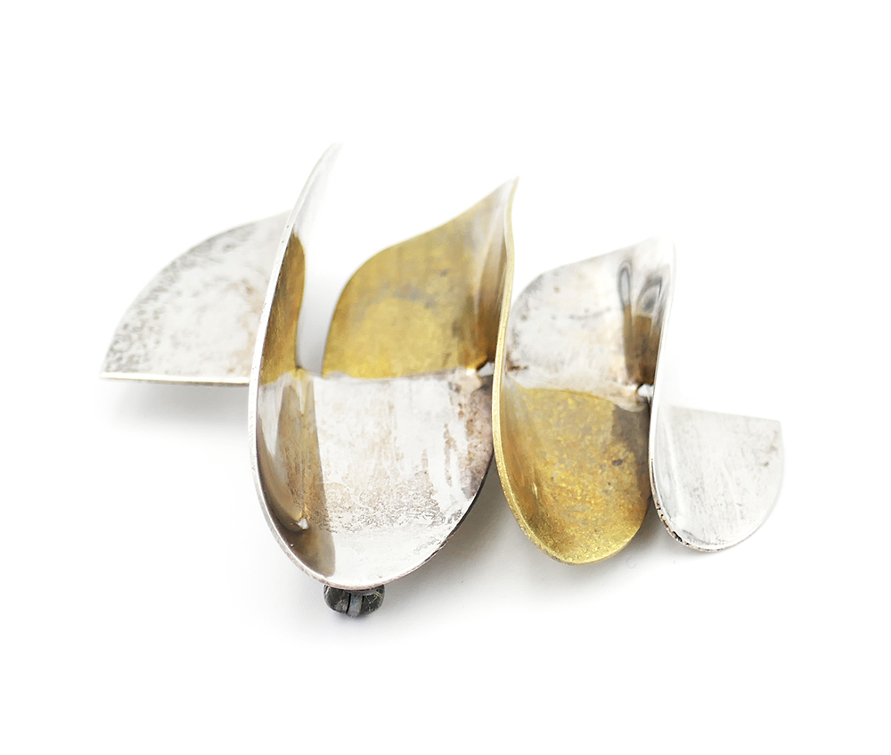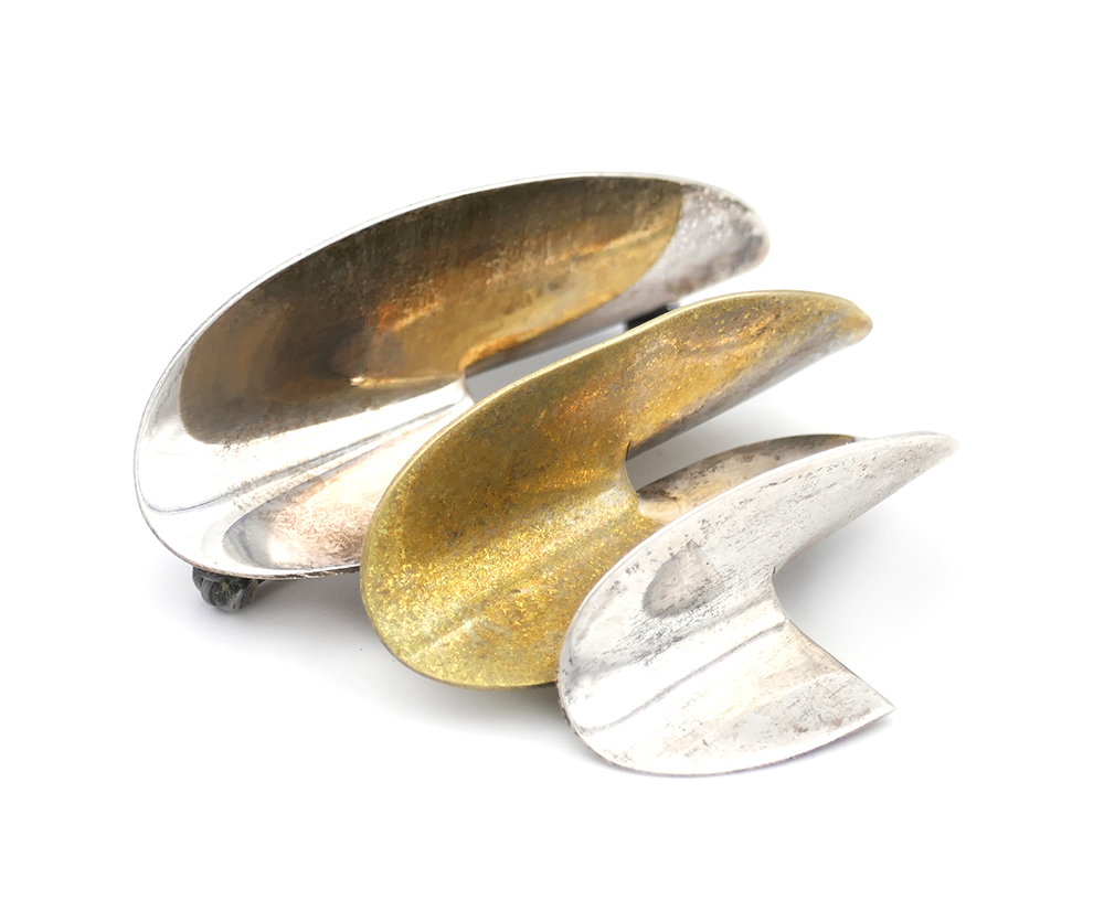 Plastischer Korpus aus überwiegend Silber (925er) und teilweise vergoldetem Messing in Form einer im Randbereich ovalär begrenzten und sich nach unten verjüngenden, abgeflachten Spirale. Maße ca. 5,5 x 5,5 cm, Tiefe ca. 2 cm, leichte Patina und geringe Tragespuren. Rückseitig Sicherheitsverschluss mit Kugelkopf und Markung bzw. Bezeichnung “Mexico TC-103 925” sowie “Laton ” (= Messing in spanischer Sprache). Wohl 1960er, 70er Jahre.
