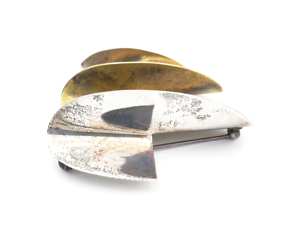 Geometrisch-abstrahierte Brosche aus Silber und Messing