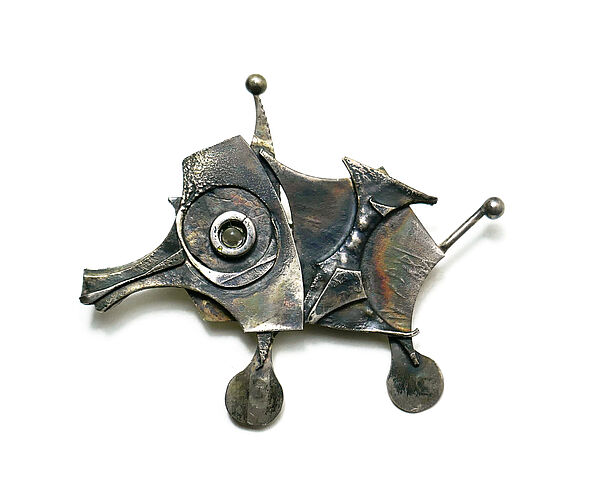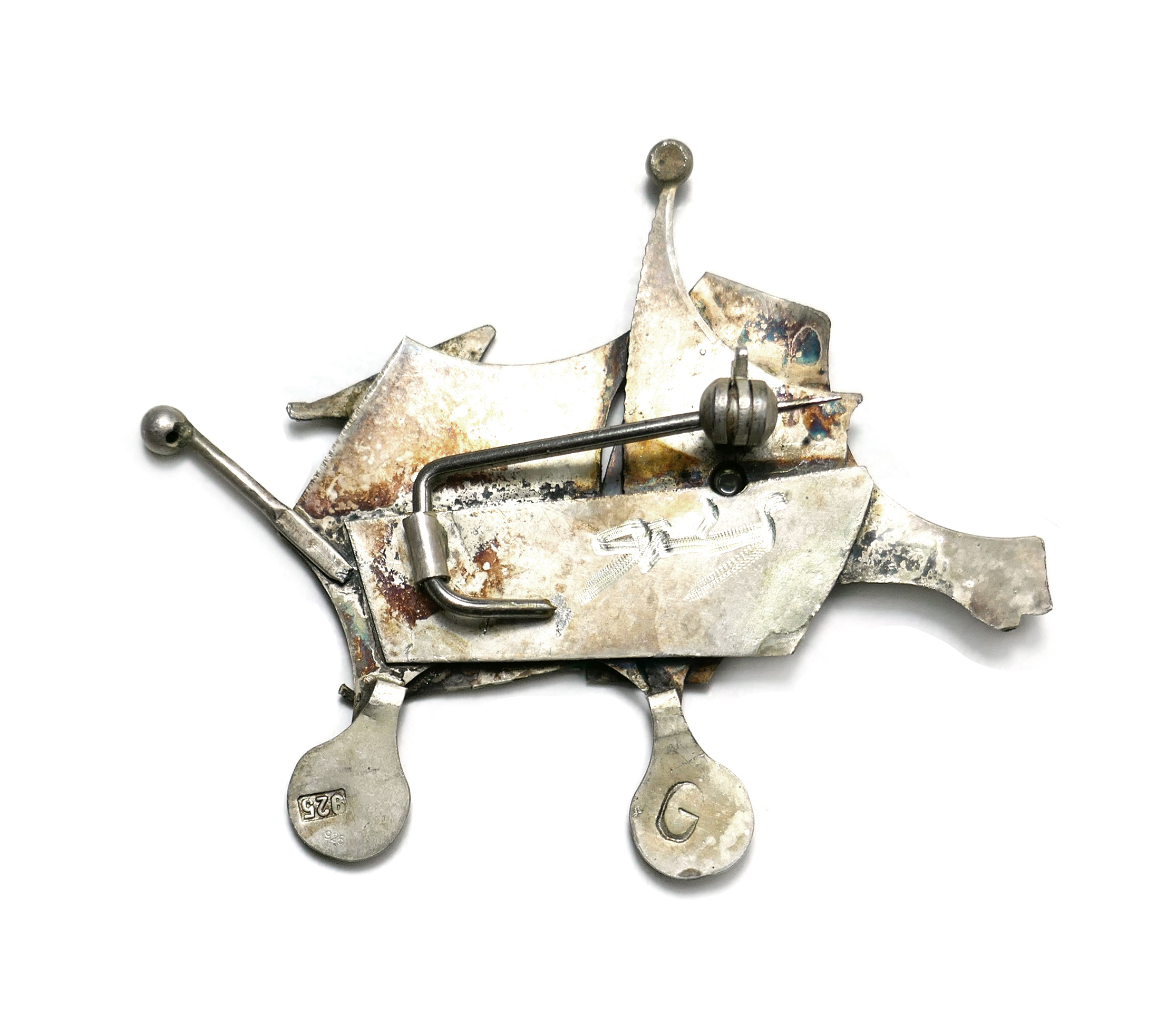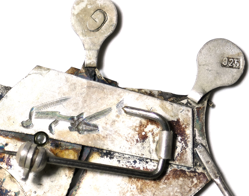Handgefertigter, flach-plastischer Silberkorpus (925er) in Form eines skurrilen Fisches. Rückseitig monogrammiert mit “G” sowie ungedeutete Ritzsignatur, zudem Sicherheitsverschluss mit Kugelkopf. Maße ca. 4,5 x 4 cm, ungeputzter Zustand mit partiell dunkler Patina und leichten Tragespuren. Wohl Deutschland der 1960er Jahre.