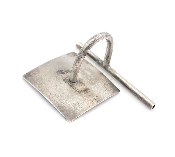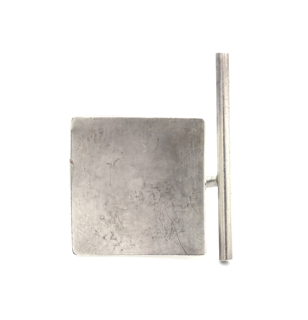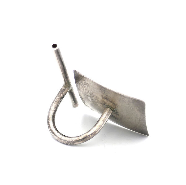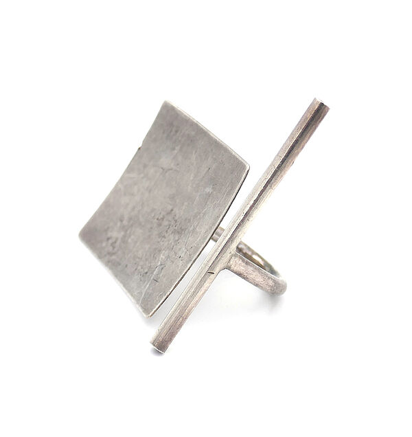 Handgearbeiteter, skulpturaler Silberring (geprüft): die Ringschiene wird durch ein zartes, halbkreisförmiges, vorne geöffnete Rohr gebildet, deren eines vorderes Ende wird durch eine quadratische, leicht konkave Platte “abgeschlossen”, das andere Ende durch ein weiteres, gerades, zur Ringschiene rechtwinklig verlaufendes Rohr. Maße der Platte ca. 3 x 3 cm, Stablänge ca. 4,6 cm, Ring-Innendurchmesser ca. 18 mm, es zweigen sich neben einer leichten Patina deutlichere Tragespuren, insbesondere eine winzige “Narbe” am Rand der Platte. Ungemarkt, wohl 1960er, 70er Jahre.