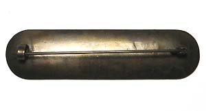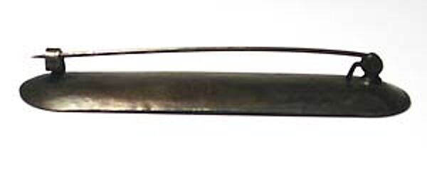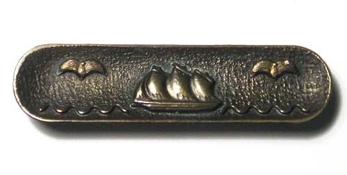 Der bandförmige, an den Enden abgerundete, leicht konkav gemuldete Messingkorpus weist vorderseitig aufgesetzte, plastisch ausgearbeitete Dekorelemente in Form eines Schiffes, von Wellen und Möwen auf. Länge ca. 7 cm, Breite ca. 1,8 cm, ungeputzter Zustand mit fast gleichmäßiger Patina und geringen Gebrauchsspuren. Rückseitig einfache Broschierung. Unbezeichnet, aber aufgrund des typischen Dekors wohl Fischland-Schmuck der 1940er, 50er Jahre zuzuordnen.