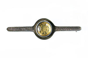 Silberne Stabbrosche mit Hinterglasmalerei einer Eule