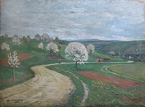 Ölgemälde: Frühlingslandschaft mit blühenden Obstbäumen