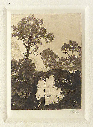 Lithografie: ohne Titel (Schäfer mit Schafherde beim Heimtrieb auf einem Waldweg)
