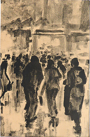 Lithographie: ohne Titel (Arbeiter vor dem Werkstor)