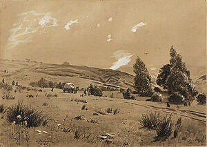 Sepiazeichnung: ohne Titel (hügelige Landschaft mit Pferdewagen)