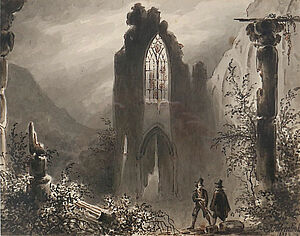 Lavierte und aquarellierte Tuschezeichnung: o.T. (zwei Männer im Gebirge vor Ruine)