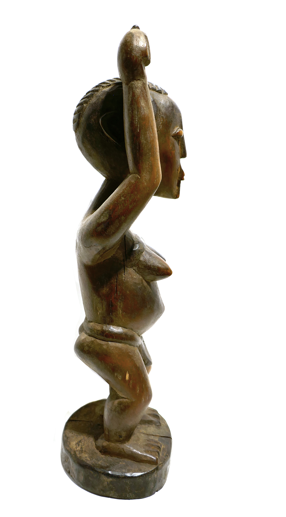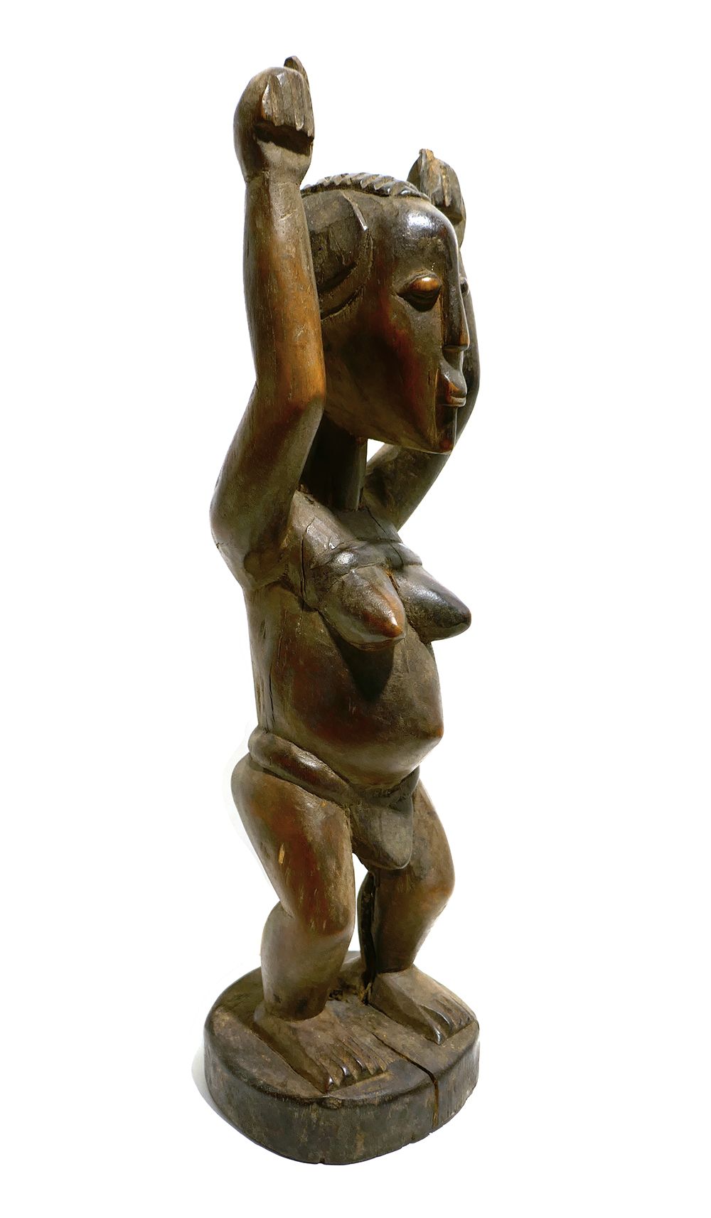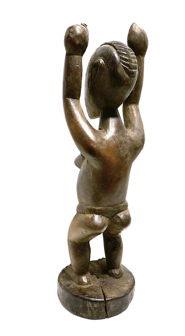 Handgeschnitzter Korpus aus dunkelbraunem Holz. Dargestellt ist ein archaisch-stilisierter weiblicher Akt mit schmalen Lendenschutz und erhobenen Armen, auf scheibenförmiger Plinthe. Höhe ca. 32 cm, moderate Altersspuren, so zeigt sich schmaler Spannungsriß des Holzes an der Plinthe. Untersieitig Aufkleber, hier vom Vorbesitzter handschriftlich bezeichnet, u.a. “erworben RSA Durban 2006”