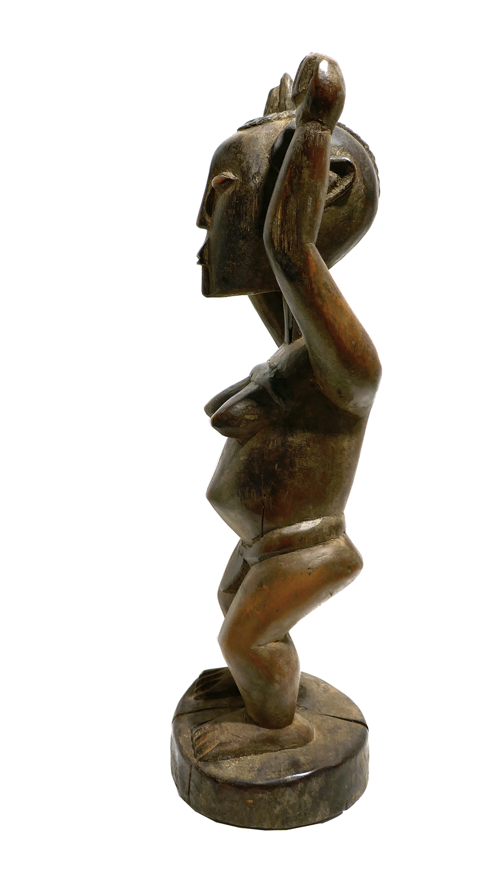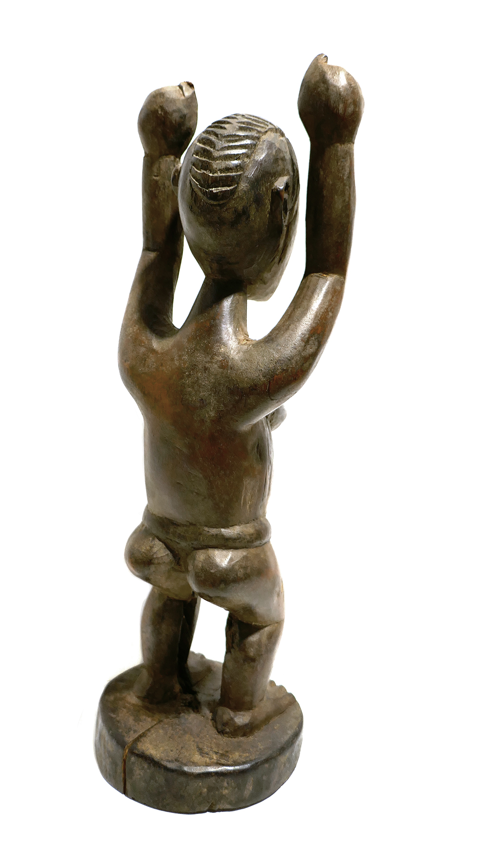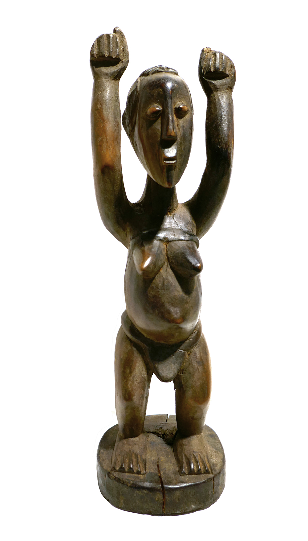 Handgeschnitzter Korpus aus dunkelbraunem Holz. Dargestellt ist ein archaisch-stilisierter weiblicher Akt mit schmalen Lendenschutz und erhobenen Armen, auf scheibenförmiger Plinthe. Höhe ca. 32 cm, moderate Altersspuren, so zeigt sich schmaler Spannungsriß des Holzes an der Plinthe. Untersieitig Aufkleber, hier vom Vorbesitzter handschriftlich bezeichnet, u.a. “erworben RSA Durban 2006”
