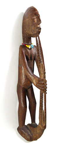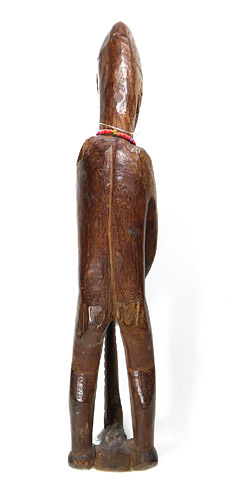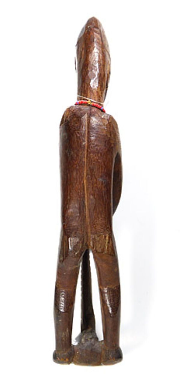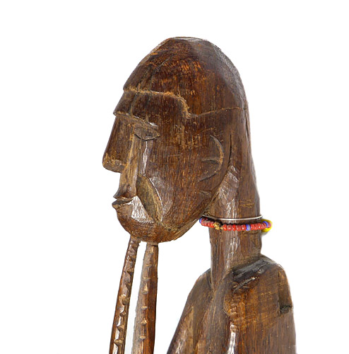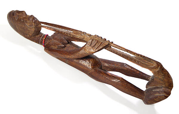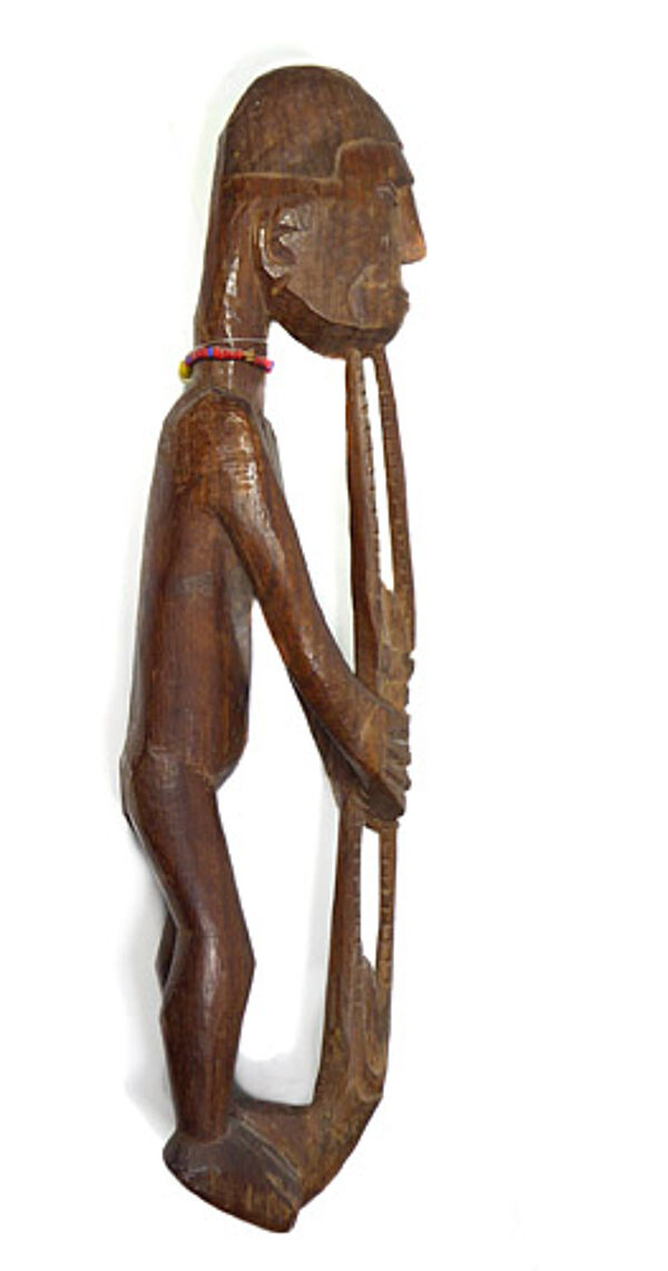 Handgeschnitzter, stilisierter Holzkorpus mit Perlenkette (Krieger mit Bogen?), Höhe ca. 42 cm, moderate Altersspuren. Ozeanien?