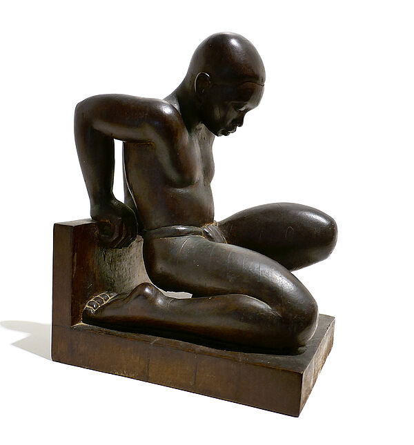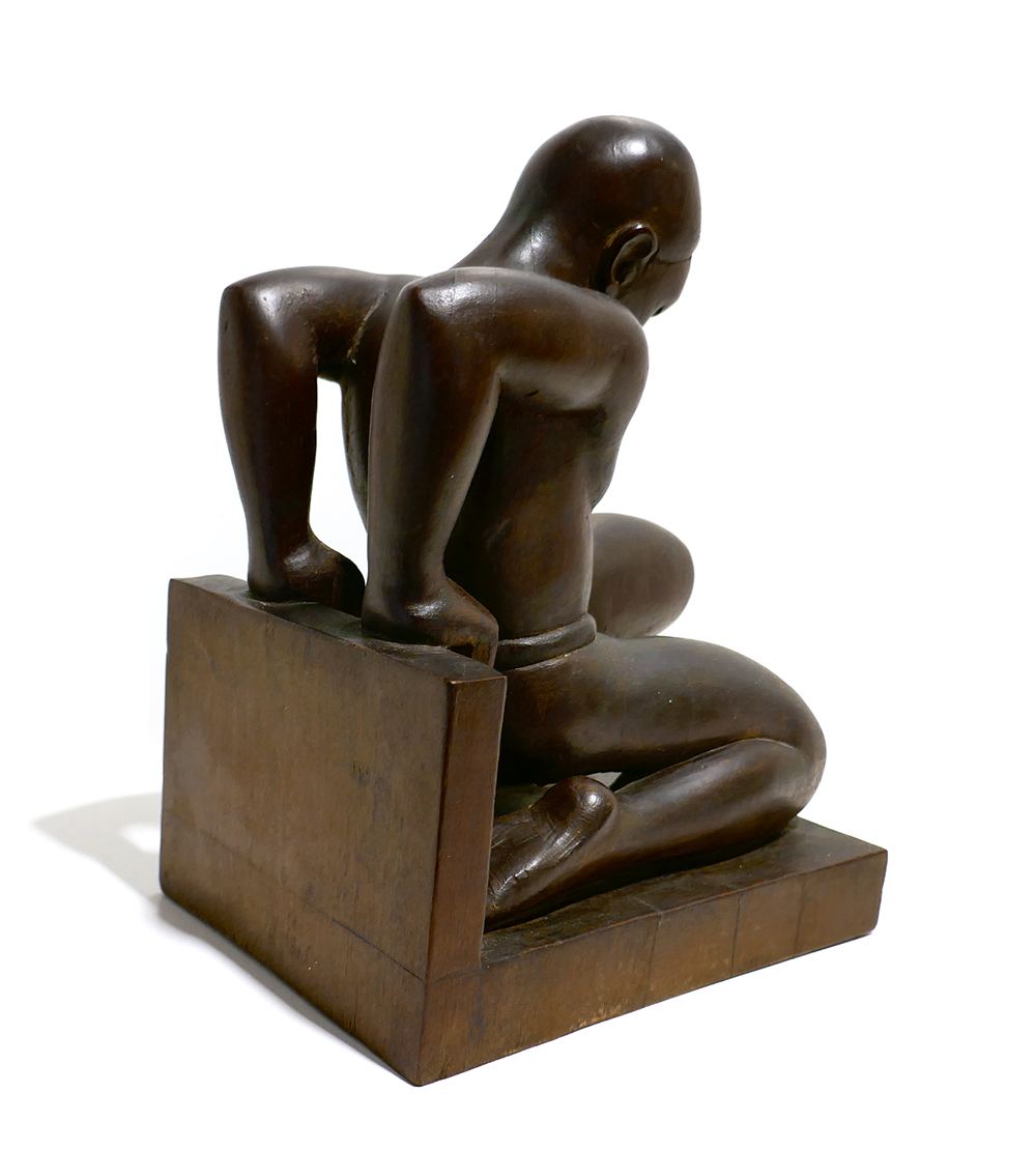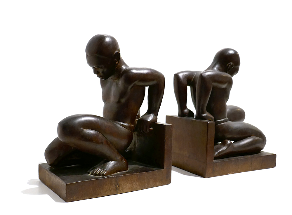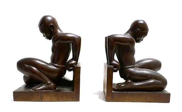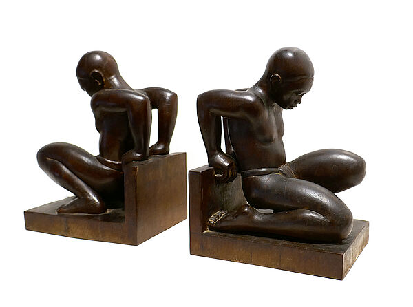 Paar figürliche, geschnitzte Buchstützen aus dunklem Edelholz, auf abgekanteter Basis kniet jeweils eine vollplastisch gearbeitete, männlichen Figur, die lediglich mit einem Lendenschurz bekleidet ist. Höhe ca. 22,5, Standfläche ca. 17 x 12,2 cm, eine Figur wurde im Kopfbereich geklebt, sonst nur geringe Altersspuren. An der Unterseite altes, nicht mehr lesbares (Sammlungs?)Etikett mit Stempel und Inventarnummer “AB 3511b”, wohl Frankreich der 1920er 30er Jahre.