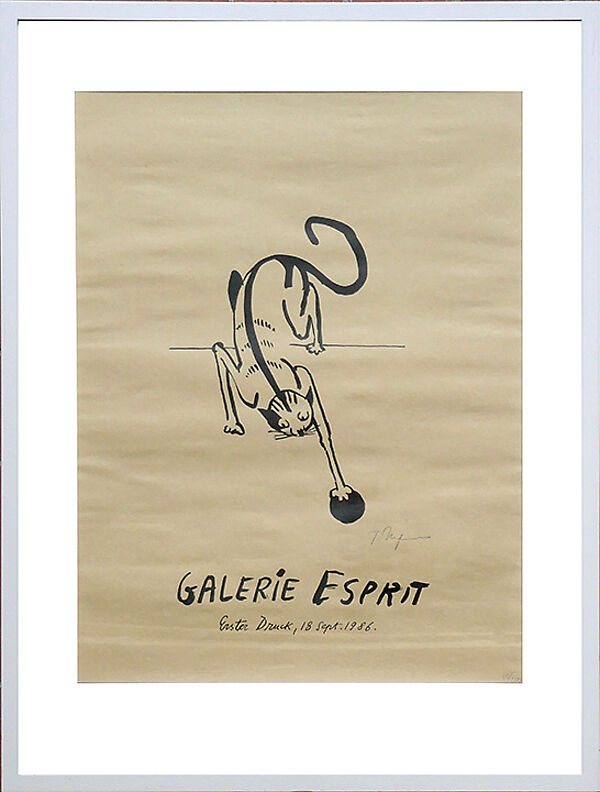 Lithografie auf dunkel-chamoistonigem Papier. Rechts im unteren Drittel handsigniert. Rechts unten Auflagenbezeichnung "60/200". Dargestellt ist eine stilisierte Katze, die eine Pfote nach einem Ball oder Wollknäuel ausstreckt. Zudem Bezeichnung "Galerie Esprit - Erster Druck, 18. September 1986". Maße ca. 60 x 47 cm, geringe Altersspuren. Ohne Rahmen.