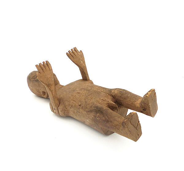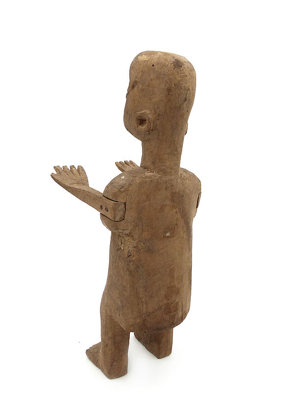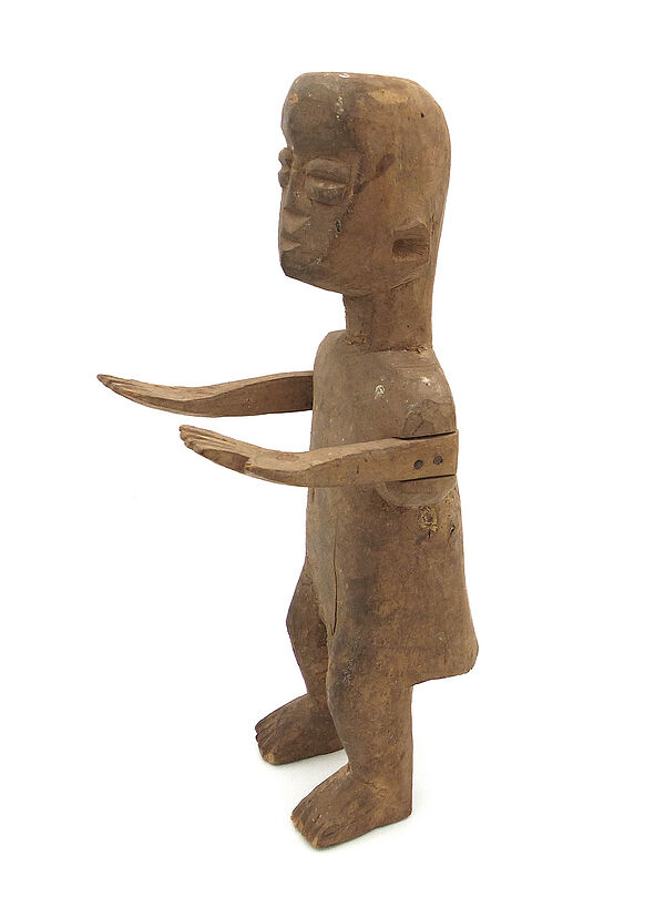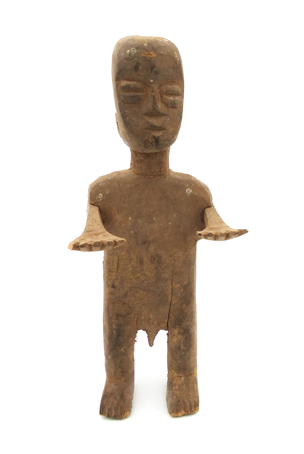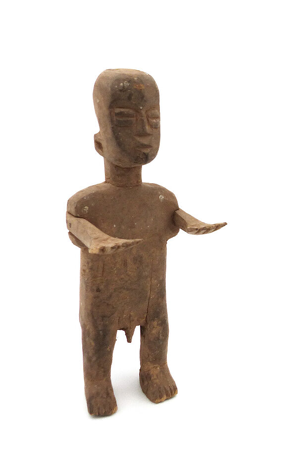 Vollplastischer, handgeschnitzter Holzkorpus einer stilisierten männlichen Figur, wobei die Arme mit kleinen Stiften angesetzt wurden. Höhe ca. 24 cm, moderate Patina (ein Gebrauch der Figur im Voodoo-Kult ist wahrscheinlich).
