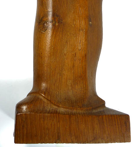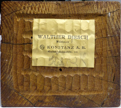Leicht stilisierter, handgeschnitzer und polierter Holzkorpus auf kleinem, quadratischen Sockel. Höhe ca. 46,7 cm, Standfläche 10,8 x 10 cm, geringe Altersspuren, rückseitig kaum sichtbarer (verschliffener) Rest einer alten Montierung. Unterhalb der rechten Knieregion wird die ansonsten gleichmäßige Maserung durch einen Astbereich unterbrochen. Seitlich am Sockel ligiertes Künstlermonogramm und Datierung "1947", unterseitig Papieretikett "Walther Diesch - Bildhauer - Konstanz A.B." (Lebensdaten unbekannt).