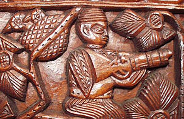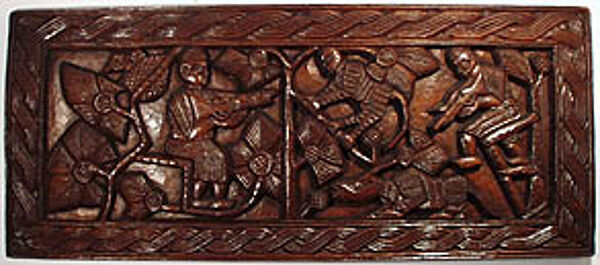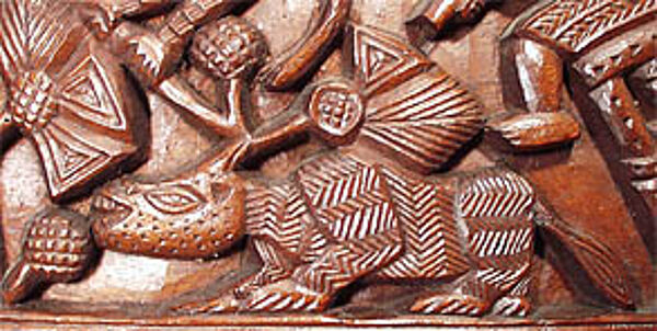 Naives, fast archaisch wirkendes Relief aus rötlich braunem Holz einer Jagdszene. Maße ca. 64 x 26,5 cm, Tiefe ca. 1,5 cm; minimale Gebrauchsspuren. Unbezeichnet, asiatische Arbeit der 20er Jahre ??