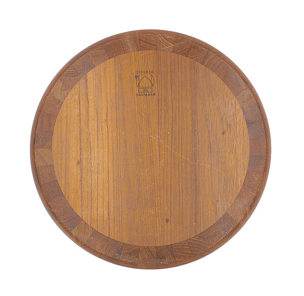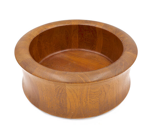 Schalenförmiger Korpus aus geleimten, mittelbraunem (Hart-)Holz mit steiler Wandung, die mittig leicht konkav gewölbt ist. Dazu passend zwei große Salatlöffel mit jeweils halbkugelförmigen Laffen. Maße der Schale ca.30 x 30 x 12,5 cm, Länge der Löffel jeweils ca. 35 cm. Geringe Alters- und Gebrauchsspuren. Unterseitig gemarkt. Wohl 1970er Jahre.