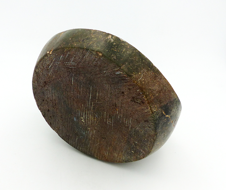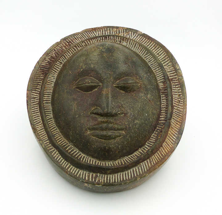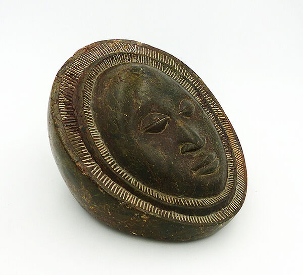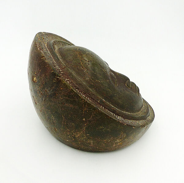 Handgearbeiteter, annähernd einer abgeflachten Halbkugel ähnelnder Specksteinkorpus. Oberseitig Relief eines leicht stilisierten, symmetrischen Gesichtes, umgeben von einem doppelten Strahlenkrant. Der Rest des Korpus ist poliert. Höhe ca. 12 cm, Länge ca. 20 cm, Breite ca. 18 cm, moderate Altersspuren.