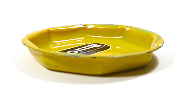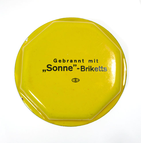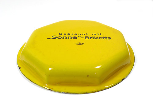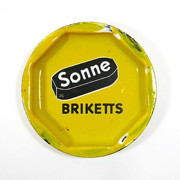 Leuchtend gelb emaillierter, flach schalenförmiger Metallkorpus mit ausgestelltem Randbereich, nach innen hier 8-eckige Begrenzung. Im Grund der Schale stilisierte Darstellung eines Briketts mit der Bezeichnung "Sonne", darunter "BRIKETTS". Rückseitig Bezeichnung "Gebrannt mit Sonne-Briketts" sowie Hersteller-Logo "CRD", bisher nicht "aufgelöst. Durchmesser ca. 12,5 cm, Höhe ca. 2 cm, moderate Abplatzer der Emaille im Randbereich (siehe Fotos), sonst eher geringe Alters- und Gebrauchsspuren. Wohl 1920er Jahre.