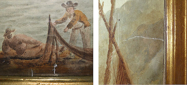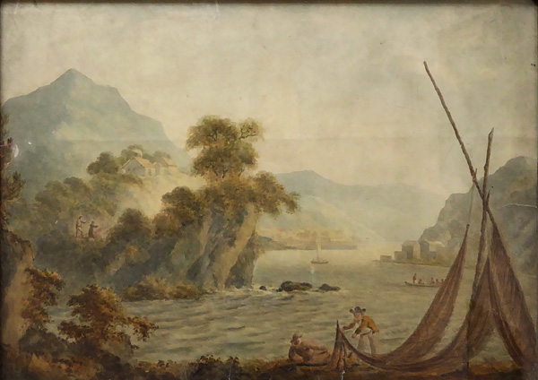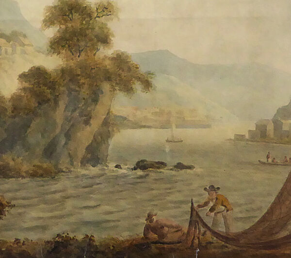 Aquarell auf Papier, unsigniert und undatiert (nicht entrahmt). Sichtmaße ca. 62,5 x 44,5 cm, Außenmaße der alten, goldgefassten Stuckleiste ca. 78,5 x 60,5 cm. Es zeigen sich im Randbereiche mehrere Einrisse des Papiers (siehe Foto), ansonsten eher moderate Altersspuren. Wohl Italien um 1780 bis 1800.