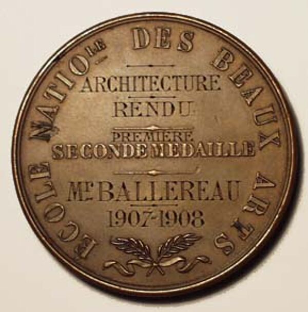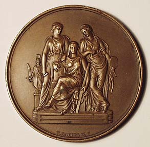 Klassizistische Bronze-Medaille, vorderseitig ist die Allegorie der bildenden Künste nach einer Zeichnung von Ingres dargestellt, re. u. signiert: "E. GATTEAUX. F."; rückseitig umlaufende Inschrift: "ECOLE NATIO(na)le DES BEAUX ARTS" mittig graviert "ARCHITECTURE - RENDU - PREMIERE - SECONDE MEDAILLE - Mr. BALLEREAU (vermutlich der Ausgezeichnete) 1907-1908". Durchmesser ca. 5 cm, warme gleichmäßige Patina mit geringen Gebrauchsspuren. Die Medaille wurde wohl um 1835/40 entworfen, rückseitige Gravur und evtl. auch Guß später.