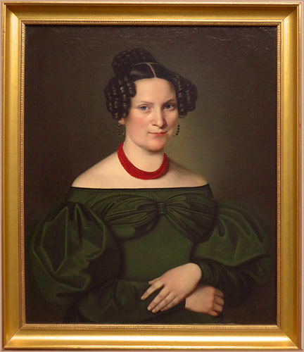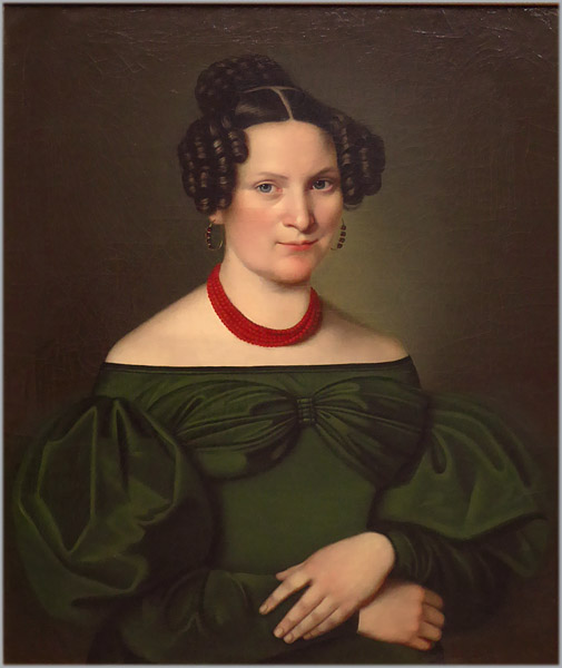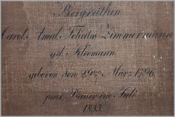 Fein ausgeführtes, subtil charakterisierendes Portrait der Ehefrau des Eislebener Bergrates Victor Leopold Friedrich Zimmermann. Öl auf Leinwand, rückseitig betitelt, signiert und datiert "Juli 1833". In älterer vergoldeter, einfach gekehlter Holzleiste gerahmt. Bildmaße ca. 69 x 57 cm, Rahmenaußenmaße ca. 76,5 x 65 cm, geringe Altersspuren, so Craquelée.