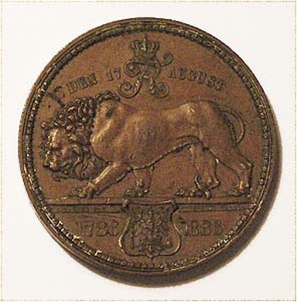 Vorderseitig Brustbild Friedrich des II nach links, Umschrift: "FRIEDRICH II KOENIG VON PREUSSEN", Monogrammiert "AK" und bezeichnet "G. Loos". Rückseitig nach links schreitender Löwe, oben zudem Datum und Monogramm "FR" mit Krone, im Abschnitt Wappen und Jahreszahlen 1788 - 1886. Durchmesser ca. 4,8 cm, fast gleichmäßige Patina mit geringen Gebrauchsspuren.