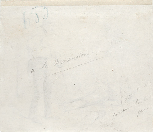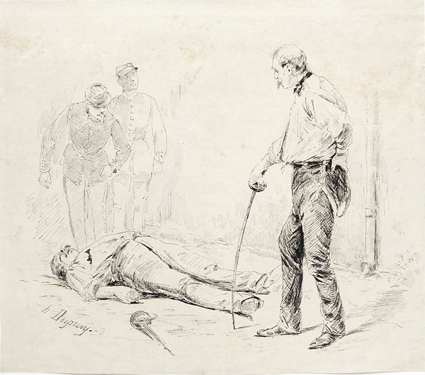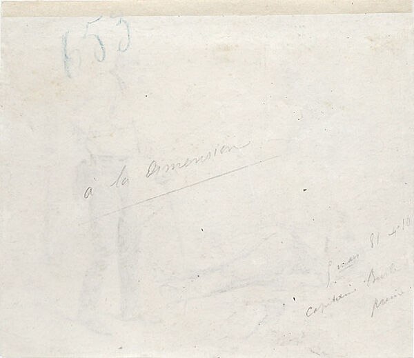 Feine Federzeichnung auf chamoistonigem Papier, links unten signiert, wohl "H. Duprony" (Lebensdaten unbekannt). Blattmaße ca. 21,7 x 19 cm, geringe bis moderate Alters-, Griff- und Lagerspuren, an der linken oberen Ecke leicht fleckig, rückseitig an der Oberkannte Pfalz einer alten Montierung, hier auch unleserlich mit Bleistift bezeichnet. Wohl Frankreich der 1860er bis 80er Jahre.